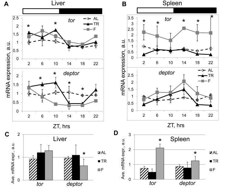 To dissect whether the observed rhythms in expression of mTORC1 components resulted from the rhythmic supply of nutrients or from an internal regulation, we assayed their expression in the liver and spleen of mice that were subjected to fasting. Rhythms in expression induced by TR feeding persisted under these constant (fasting) conditions (Figure 6A and B); however, similarly to the observed difference between the first and next cycles in mTORC1 target phosphorylation (Figure 2), we observed a specific difference between TR and fasting rhythms. Maximums of expression of tor and deptor in TR samples were more prolonged than in fasting samples, suggesting that rhythms in TR arise from a combination of feeding/nutrient-dependent and internally regulated mechanisms. These results are in striking contrast to the effects of TR feeding on the expression rhythms of clock genes (Figure 4). The expression rhythms of the circadian clock genes had small amplitudes in the spleen and high amplitudes in the liver; in both cases the rhythms were not affected by TR feeding (Figure 4). On the contrary, TR feeding resulted in a great increase in the amplitude of rhythms in the expression of deptor: the amplitudes were equally high in both tissues (Figures 6A and 6B). Interestingly, in fasting animals, phases of the expression rhythms for tor were different between the liver (the maximum was at ZT6) and the spleen (the maximum was at ZT14), the same was true for deptor: expression in the liver had the maximum at ZT2 and in the spleen at ZT14. The phase shift in the expression between the liver and spleen is in an agreement with different phases of mTORC1 activity in these tissues (again in a contrast to the same phases of circadian clock gene expressions in the liver and spleen). Thus, rhythms in deptor and tor expression induced by TR feeding are uncoupled from rhythms in the circadian clock gene expression, which further supports the difference between the light-entrainable circadian clock and NAMO. We also calculated the average daily expression of tor and deptor under different conditions. In the liver (Figure 6C) and spleen (Figure 6D), TR did not affect the daily average for tor and deptor, thus, the effect of periodic feeding/nutrient supply resulted mostly in a redistribution of expression across the day. Fasting significantly affected the daily average and distribution of expression for deptor in the liver and expression of tor in the spleen, again suggesting that expression of these genes is under control of internal and external regulators.