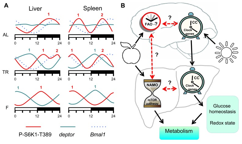 There are many oscillating processes in biology such as the cell cycle, daily cycle, reproduction cycle and developmental cycle. Daily rhythms in behavior and physiology of living organisms are well known; some of these rhythms are driven by external cues and others are controlled by internal mechanisms. One of the systems regulating daily activity is the circadian clock. The circadian clock is the light-entrainable genetically determined system composed of several interdependent transcription-translation feedback loops, which generates periodicities in sleep, locomotor activity and metabolism known as the circadian rhythms. The circadian clock is not the only internal clock that generates rhythms with a near 24-hr periodicity: rhythms in food anticipatory (FA) behavior is one of the best known examples of 24-hr rhythms generated independently from the light-entrainable circadian clock; moreover, a transcription-independent circadian (24h-periodical) clock was recently reported to control the cellular redox state [10]. Transcription-translation feedback loops comprising the known circadian clock in animals and other organisms have been discovered about two decades ago; however, molecular components of food-entrainable oscillators are still unknown, which imposes significant limitations on the research of these oscillators. Recently, it was proposed that FA clocks in peripheral organs and in the CNS interact in order to generate the net FA activity [4]. Using the time restricted feeding paradigm, we found that daily rhythms in mTORC1 activity are under control of an internal food-entrainable oscillator, which we named NAMO. We found that NAMO is not identical to the known light-entrainable circadian clock. Indeed, the experimental approach used in our study let us to uncouple the rhythms in mTORC1 activity from the circadian rhythms in expression of the canonical clock genes. Figure 7A summarizes the effects of different feeding regimens on NAMO- and the circadian clock-controlled rhythms in different tissues. Rhythms in circadian clock gene expression in the liver and spleen had the same phase and were not influenced by different feeding regimens (i.e., maximum of Bmal1 expression was reached at the same time), on the other hand, rhythms in mTORC1 activity were significantly shifted by the time-restricted feeding, and phases of these rhythms were different in different tissues. Under conditions of TR feeding, we observed two maximums in the liver (ZT14 and ZT22), while under fasting conditions - only one maximum at ZT14, which was different from the AL maximum at ZT18. We propose that the internal oscillator produces the ZT14 maximum, which is preserved upon fasting, while the ZT22 maximum is associated with the external feeding cue. The less pronounced ZT18 maximum detected under the AD conditions could be thus a combination of the internal maximum and multiple local peaks in mTOR activity resulting from AD food consumption. Recently, an interaction between the circadian clock and the mTOR signaling pathway has been proposed [5, 6]; however, our findings that the rhythms in mTORC1 activity are preserved in the tissues of circadian clock deficient mice clearly demonstrate that these rhythms are under control of a different, independent internal oscillator - NAMO. Importantly, in a strong contrast to expression of clock genes, expression of tor and deptor was dramatically affected by rhythmic feeding; moreover, in agreement with the shift in mTORC1 activity, expression of tor and deptor was phase-shifted between the liver and the spleen, while circadian genes expressed with the same phases in both organs.
