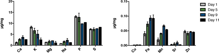Lowered potassium levels, for example, can lead to hypokalemia, effecting muscle function. Hypokalemia has serious consequences on human health via its association with a higher risk of atrial fibrillation and cardiac arrest, common heart problems in elderly [38]. Phosphorus is needed for maintenance and repair of all tissues and cells, as well as production of DNA and RNA. It also facilitates use of other minerals and vitamins, including vitamin D, iodine and zinc. Future experiments will be required to learn whether a decrease in these elements have deleterious consequences in C. elegans.