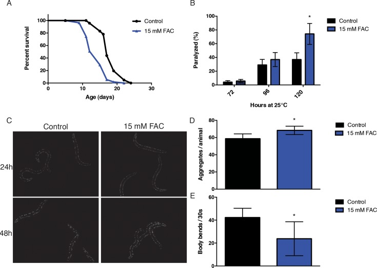 We noted that iron exhibited a high magnitude of accumulation with aging and we were aware of its role in neurodegenerative-associated protein aggregation. Consequently, we decided to investigate whether an increase in dietary iron could promote aging in C. elegans. In agreement with previous reports, we found that supplementation with 15 mM ferric ammonium citrate (FAC) resulted in a modest but robust reduction in mean and maximum lifespan (Fig. 2A). Iron has been shown to affect protein aggregation associated with various neurodegenerative diseases and aging in C. elegans has been strongly associated with a loss in proteostasis. In order to investigate whether the effects of dietary iron enrichment on lifespan could be via effects on altered proteostasis, we took advantage of a series of well-characterized C. elegans protein aggregation models. We first tested a temperature-conditional strain, CL4176 [smg-1 (cc546ts); dvIs27(myo-3::Aβ3–42 let 39UTR(pAF29))]. The hall-mark protein associated with Alzheimer's disease (AD) inclusions, Aβ, accumulates in the body wall muscle when this strain is grown at 25°C, leading to paralysis of the animals. We exposed animals to a diet containing 15 mM FAC simultaneously shifting them to 25°C while scoring for the frequency of paralysis each subsequent day. We found that exposure to a diet of 15 mM FAC increased the rate of paralysis in the Aβ transgenic animal (Fig. 2B). Polyglutamine (PolyQ) aggregation is a key pathological hallmark of Huntington's disease (HD) and other related neurodegenerative disorders. We examined PolyQ aggregation in Q40::YFP transgenic animals AM141 rmIs133[P(unc-54) Q40::YFP)] upon transient exposure to 15 mM FAC from the young adult stage. We found that iron had a modest but significant effect on the numbers of polyglutamine inclusions in this second protein aggregation model (Fig. 2C, Fig. 2D).