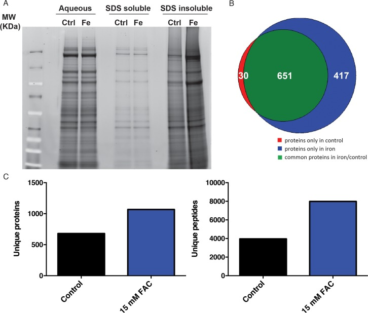 Various major disease-specific proteins have been found to become more prone to aggregate or change conformational structure in response to iron supplementation. However, a systematic evaluation of protein aggregation in response to elevated environmental iron exposure to date is lacking. In order to determine proteomic changes in response to iron in a non-biased manner, we undertook a biochemical approach. We and others have shown that a fraction of the C. elegans proteome becomes increasingly insoluble with age [28, 29]. The insoluble fraction of the C. elegans proteome can be separated with strong detergent buffers such as SDS, where the remaining fraction (the ‘insolublome’) can be re-solubilized by formic acid and visualized on SDS-PAGE gels. We used this approach to identify proteins vulnerable to loss of solubility upon dietary iron supplementation. Consistent with previous findings, we observed that the SDS insoluble protein fraction as assessed by SDS PAGE gel significantly increased with age. Furthermore, 7 day old worms exposed to 15 mM FAC from day 1 of adulthood had a striking increase in insoluble proteins compared with 7 day old controls (Fig. 3A). When comparing age-induced aggregation with aggregation promoted by iron supplementation, we were struck by the apparent similarity in the banding pattern on SDS-PAGE gels. Based on this, we conjectured that elevated dietary iron may result in an acceleration of aging-associated protein insolubility. To further investigate, we proteolytically digested the SDS-insoluble fractions (in an in-solution digestion protocol) and utilized mass spectrometry to first identify and then quantitate proteins within the insoluble fraction in the absence and presence of iron supplementation. Reflecting the SDS PAGE result, we identified 681 proteins for control worms and 1068 proteins for iron-treated worms, with only 30 unique proteins exclusively observed in controls, but 417 unique proteins in iron-treated counterparts (Fig. 3B, Fig. 3C, Table S1 and S2), suggesting that iron potentiates the tendency of numerous proteins to aggregate. Once these sets of aggregation-prone proteins were identified, we looked for common functional or structural features. Using the DAVID v.6.7 software (The Database for Annotation, Visualization and Integrated Discovery) [34], we found a strong similarity in the functional classes of proteins that were identified in iron-supplemented versus control cohorts. Insoluble proteins from iron-supplemented worms were found to be enriched in several functional categories (Kegg pathways) including the ribosome, TCA cycle, oxidative phosphorylation and the proteasome (Table 1A). Interestingly, we observed a strong similarity in the functional classes of aggregation-prone proteins in aged [29] and iron-treated animals, suggesting that iron supplementation and aging have very similar effects on protein insolubility.