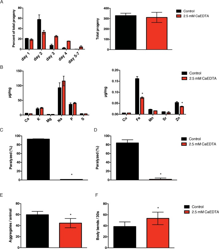 Based on our data, iron appears to accelerate at least one important feature of normal aging, the accumulation of insoluble protein. We reasoned that if we reduced the impact of metals on insoluble protein formation, we might extend healthspan and possibly lifespan. In order to investigate the role of metal accumulation, we needed an efficient method of reducing the endogenous metal load. Metals are known to play important functions in growth, development and reproduction. After testing various metal chelators, we found that exposure to CaEDTA from the egg stage delayed development and that exposure from the 4th larval stage delayed reproduction (Fig. 4A), suggesting that CaEDTA is readily absorbed and bioavailable in C. elegans. In order to test the ability of CaEDTA to reduce metal levels in adult worms, we exposed hermaphrodite worms to CaEDTA continuously from day 1 of adulthood and measured their metal profile by ICPaes 4 days later. We found that exposure to 2.5 mM CaEDTA significantly reduced levels of iron and, to a lesser extent, zinc (Fig. 4B).