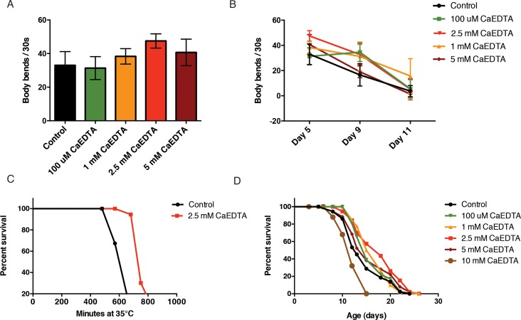 We next investigated the effects of CaEDTA on functional aging phenotypes. As a measure of healthspan, we quantified the number of body bends throughout adulthood. We found that CaEDTA slowed spontaneous age-related declines in movement (Fig. 5A, Fig. 5B). We next addressed whether lower metal levels leads to an increase in stress resistance. We exposed day 1 adult animals to CaEDTA and measured survival after an upshift to 35°C. Transient CaEDTA exposure was found to increase the animals' survival upon heat stress (Fig. 5C). Dietary restriction is known to suppress protein aggregation, delay reproduction and increase the lifespan of C. elegans. To test whether CaEDTA acts as a dietary restriction mimetic, we measured pharyngeal pumping after treatment. We did not find any significant change in pumping rate upon CaEDTA exposure (Suppl. Fig. 2A), indicating that CaEDTA does not alter food intake. Finally, we asked if reducing the metal load would slow aging by exposing synchronized animals to CaEDTA from day 1 of adulthood and assessing survival. We found that CaEDTA significantly increased the survival of wild-type animals (Fig. 5D).