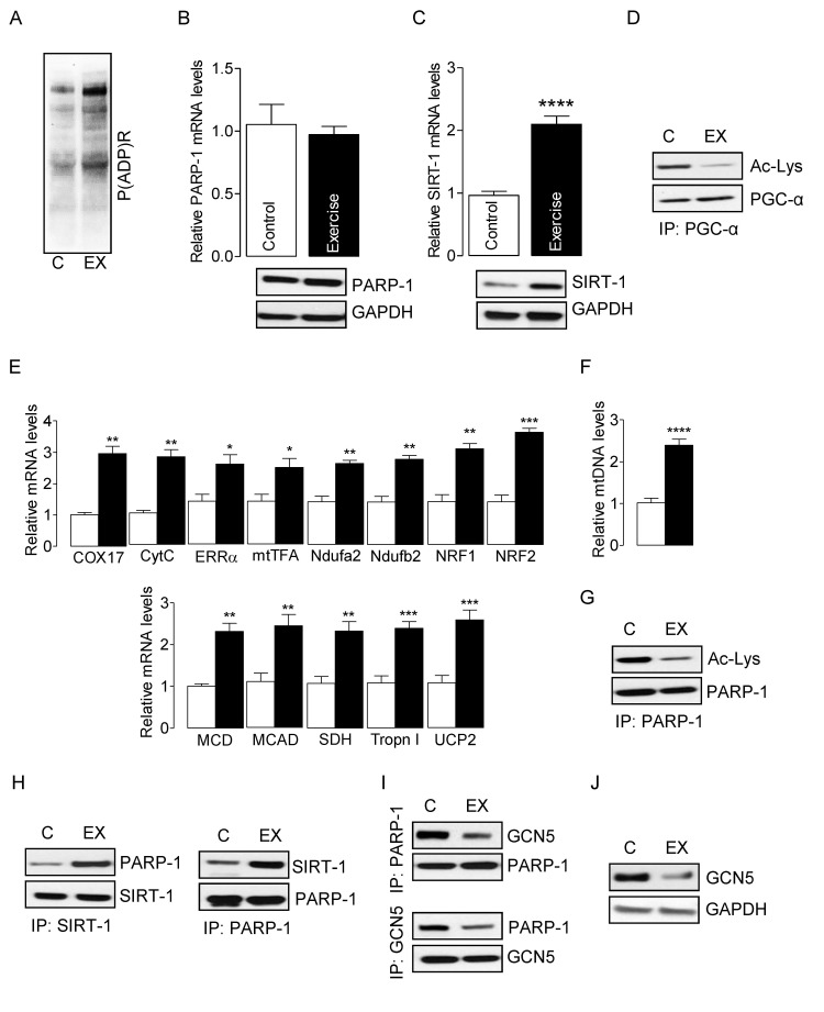 To study the interplay between SIRT-1 and PARP-1 in vivo, we induced oxidative stress in skeletal muscles of young mice using electrically evoked isometric-exercise, which has been shown to generate ROS in skeletal muscle [9, 38]. Electrically evoked exercise modestly increased PARP-1 activity in skeletal muscles, as evidenced by global protein PARylation (Fig. 1A) without altering the mRNA and protein levels of PARP-1 (Fig. 1B). In contrast, exercise significantly increased SIRT-1 mRNA and protein levels (Fig. 1C) as well as SIRT-1 activity, as evidenced by PGC-1α hypo-acetylation (Fig. 1D). The increased activation of PGC-1α resulted in up-regulation of the genes necessary for mitochondrial biogenesis and oxidative metabolism in exercised-muscle (Fig. 1E). The increased mtDNA content was confirmative of an elevation in mitochondrial biogenesis (Fig. 1F). PARP-1 activity can be modulated by its acetylation level [37, 39], and therefore, we explored the acetylation of PARP-1, as a potential mechanism that would explain the decline in PARP-1 activity in skeletal muscle from young mice. IP assays using cell lysates from exercised and non-exercised skeletal muscles demonstrated that exercise decreased the acetylation of PARP-1 (Fig. 1G), suggesting that the reduced activity of PARP-1 in exercised skeletal muscle might be due to hypo-acetylation of PARP-1. Because SIRT-1 can deacetylate non-histone proteins, and given that exercise increased the activity of SIRT-1 (Fig. 1C and D), we sought to determine if SIRT-1 could deacetylate PARP-1. Data from IP assays showed an increased association between SIRT-1 and PARP-1 proteins in exercised muscles as compared to intra-animal non-exercised muscles (Fig. 1H). Earlier studies have shown that PCAF and p300/CBP are the acetyltransferases of PARP-1 [37, 39]. Therefore, we sought to determine whether the decreased acetylation of PARP-1 was due to a reduced association between PARP-1 and PCAF or p300/CBP. Surprisingly, we could not detect any significant association between PARP-1 and p300/CBP or PCAF (data not shown). However, we did observe a substantial interaction between PARP-1 and GCN5 in which electrically-evoked exercise significantly decreased the association between GCN5 and PARP-1 proteins (Fig. 1I). Concomitant with the decreased association of GCN5 with PARP-1, the level of GCN5 protein was also significantly lower in exercised-skeletal muscle (Fig. 1J). These results indicate that the potential mechanism whereby SIRT-1 protects skeletal muscle in young mice from the elevated PARP-1 activity that is seen in old age, is via increased deacetylation-dependent inactivation and/or reduced GCN5 levels in response to exercise.