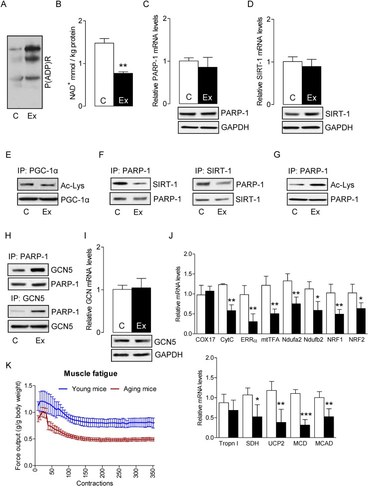 In skeletal muscles of aged mice, in which the basal oxidant level is already high, exercise has the ability to further increase oxidant production by as much as 80% [40]. As SIRT-1 inactivates PARP-1 and protects skeletal muscles in young mice, we sought to determine whether SIRT-1 could exert a similar effect in skeletal muscle from aged mice. Electrically evoked exercise robustly increased PARP-1 activity, as indicated by elevated global protein PARylation (Fig. 2A) and also reduced the intracellular NAD+ content (Fig. 2B) without changing PARP-1 mRNA and protein levels (Fig. 2C). Electrically-evoked exercise did not alter SIRT-1 mRNA and protein levels (Fig. 2D), or PGC-1α acetylation status, a result that was in contrast with the data from young mice (Fig. 2E). IP assays showed that the association between SIRT-1 and PARP-1 proteins in skeletal muscles from aged mice was greatly lower in response to exercise, which is in contrast to what we had observed for young mice (Fig. 2F). In agreement with these results, the acetylation level of PARP-1 was increased (Fig. 2G) due to an increased association of GCN5 with PARP-1 (Fig. 2H) in skeletal muscle from aged mice. To establish the role of PARP-1 acetylation by GCN5, we measured the mRNA and protein levels of GCN5. As illustrated in Fig. 2I, there were no changes in the levels of GCN5 mRNA and protein. As the acetylation status of PGC-1α was unchanged, it was not surprising to find that the genes that were necessary for mitochondrial biogenesis and oxidative metabolism in exercised-muscle were significantly lower in muscles from aged mice (Fig. 2J). To explore the dysregulation of SIRT-1 and over-activation of PARP-1 could change the muscle performance; we determined maximal isometric forces from the plantar flexor muscle of aged mice. As illustrated in Figure 2K, aged mice had an increased in vivo plantarflexor muscle fatigue as compared to young mice. This was shown by a shift to the right in the fatigue index after 30 contractions as compared to young mice. These results suggest that dysregulation of SIRT-1 in aged mice decreased mitochondrial biogenesis and oxide-tive metabolism, and increased PARP-1 activity, which in turn, increased muscle fatigue in response to exercise.