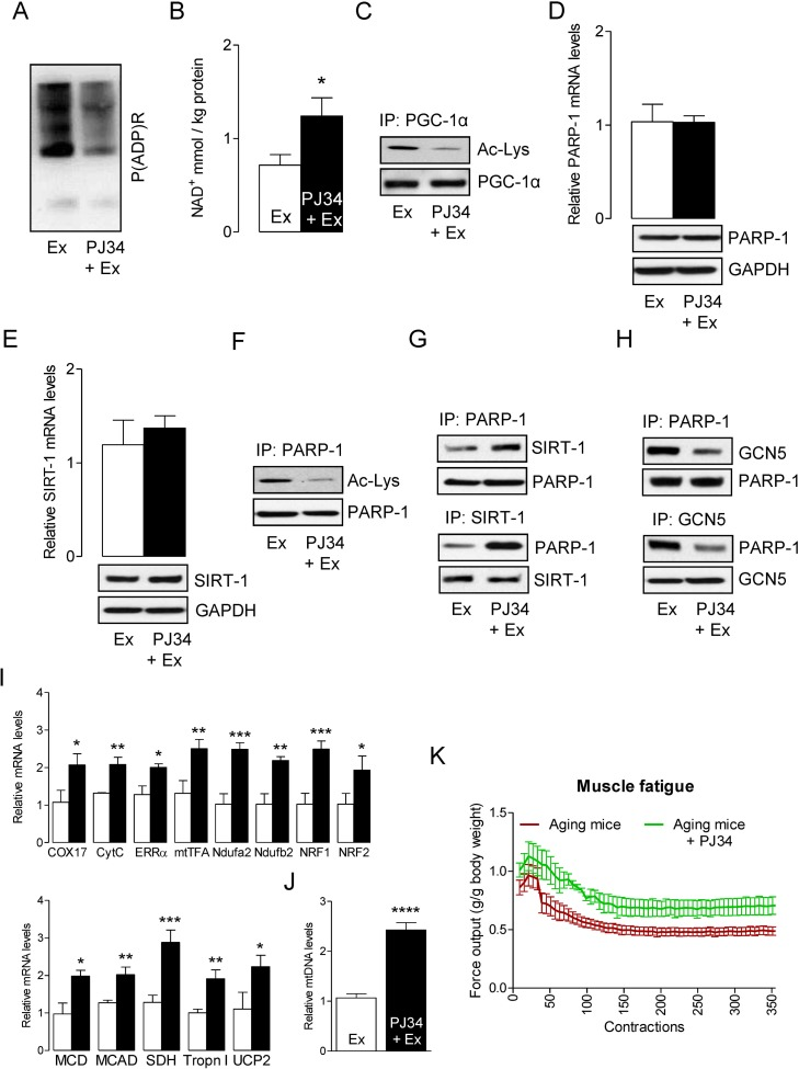 We hypothesized that inhibition of PARP-1 by the PARP-1 inhibitor PJ34 would increase the activity of SIRT-1 by elevating intracellular NAD+. To test this hypothesis, we injected PJ34 intraperitoneally in aged mice (10 mg/kg bw) 24 h prior to exercise. In agreement with our hypothesis, inhibition of PARP-1 by PJ34 reduced the exercise-induced activation of PARP-1 (Fig. 3A) and this was followed by increasing the intracellular NAD+ content (Fig. 3B). Given the impact of PJ34 on the modulation of NAD+ levels, it was not surprising to observe that mice injected with the PARP-1 inhibitor displayed higher SIRT-1 activity, as demonstrated by reduced PGC-1α acetylation (Fig. 3C). However, inhibition of PARP-1 by PJ34 did not alter PARP-1 and SIRT-1 levels (Fig. 3D and E). The increased SIRT-1 activity coincided with a decreased acetylation of PARP-1 (Fig. 3F) that was due to a strong interaction between SIRT-1 and PARP-1, (Fig. 3G) and a weak interaction between GCN5 and PARP-1 (Fig. 3H). The increased activation of PGC-1α resulted in the up-regulation of genes that are necessary for mitochondrial biogenesis and oxidative metabolism in exercised-muscle (Fig. 3I). The increased content of mtDNA further confirmed the mitochondrial biogenesis (Fig. 3J). The initial rate of fatigue for the plantarflexors was reduced in PJ34-injected mice when compare to PBS injected mice (Fig. 3K). The initial force production in the PJ34 treated animals was ~ 11.3% greater than the PBS treated animals. Force typically increases for the first ~ 30 contractions in both animal groups, likely as a result of having enhanced calcium release, then force declined thereafter as fatigue occurred. However, the average percent of force decline (i.e. fatigue index= [contraction 1-contraction 50/contraction 1x100]) was greater in control (−15.4 ± 7.1%) than in PJ34 (−0.2 ± 8.4%) treated animals after the first 50 contractions, suggesting that PJ34 reduced the initial rate of fatigue thereby delaying the onset of fatigue. Similarly, the average fatigue index after 60 contractions was greater in PBS control as compared with PJ34 treated animals (−19.1 ±9.4% vs. −9.5 ± 6.9%). However, there were no differences between the rate of fatigue after 70 (−25.7 ±6.9% vs. −19.9 ± 7.6%), 80 (−18.8 ±6.7% vs. −14.4 ± 8.3%), 100, (−31.8 ±7.5% vs. −23.3 ± 7.1%), 125 (−20.4 ±4.1% vs. −27.5 ± 12.9%), or 150 (−39.2 ±8.1% vs. −29.8 ± 13.1%) contractions in control and PJ34 treated animals, respectively. Thus, while PJ34 appeared to delay fatigue by sustaining force production over the early series of contractions (<60 contractions), it did not improve the rate of fatigue per se after 60 contractions. Nevertheless, PJ34 did permit a greater total work (area under the force x time curve) to be performed over the course of the experiment such that PJ34 supplemented animals performed 34% more work at the beginning of the contractions, and this leveled off to ~20.4% more work by the 150th contraction and stayed at this level throughout the remainder of the 360 contractions. Together these results suggest that the inhibition of PARP-1 may be an effective way to rescue skeletal muscles from ROS/PARP-1-induced decline in muscle performance (e.g., delay the onset of fatigue and increase the total sustained work) in sarcopenia.