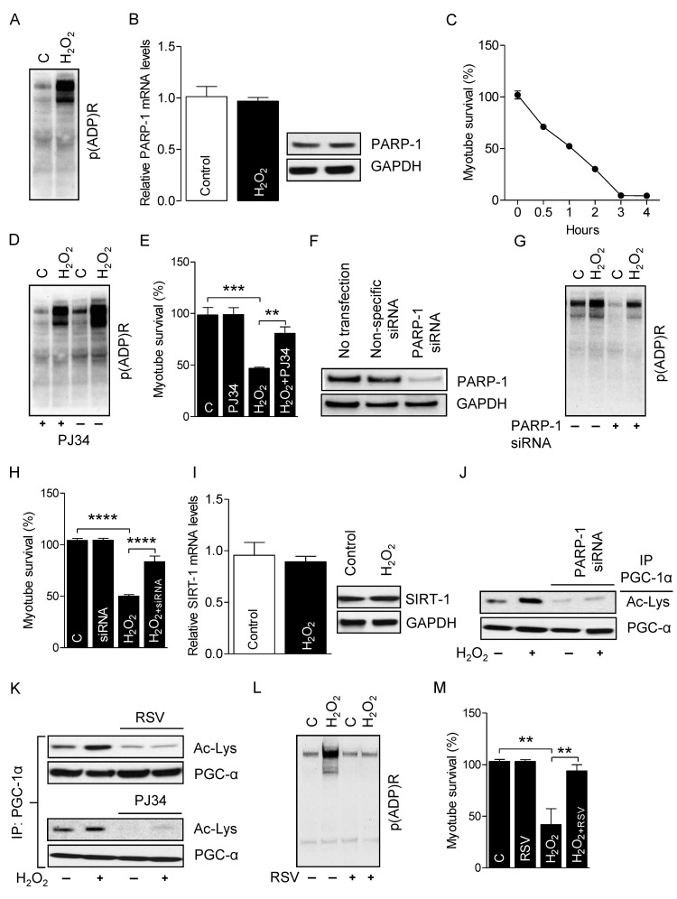 Excessive ROS induces necrotic- and apoptotic-mediated cell death [41]. To determine the role of PARP-1 on the survival of myotubes, we incubated myotubes with H2O2 (300 μM for4 h), because H2O2 is the most stable form of ROS and an established inducer of PARP-1 activity [42]. Myotubes treated with H2O2 robustly increased PARP-1 activity, as evidenced by higher global protein PARylation (Fig. 4A) without changing PARP-1 mRNA and protein levels (Fig. 4B). H2O2-treatment also significantly reduced the survival of myotubes in a time-dependent manner (Fig. 4C). However, incubation of myotubes with the PARP-1 inhibitor PJ34 (1 μM for 24 h) before H2O2 treatment substantially decreased PARP-1 activity (Fig. 4D) and increased the survival of myotubes (Fig. 4E). PARP-1 is the predominant PARP isoform in most tissues and accounts for about 90% of total cellular PARP activity [43]. Therefore, we used RNAi to suppress the level of endogenous PARP-1 in the myotubes (Fig. 4F). As expected, knockdown of PARP-1 decreased both the H2O2-induced PARP-1 activation (Fig. 4G) and myotube death (Fig. 4H), confirming the role of PARP-1 in ROS-induced myotube death. Next, we studied the impact of over activity of PARP-1 on SIRT-1 function. Myotubes treated with H2O2 did not exhibit changes in SIRT-1 mRNA and protein levels (Fig. 4I). However, H2O2-treatment did cause a substantial reduction in SIRT-1 activity, as shown by PGC-1α hyper-acetylation, and pre-incubation of the myotubes with PJ34 or PARP-1-targeting siRNAs blunted this effect (Fig. 4J). Finally, we determined if over-activation of SIRT-1 could rescue myotubes from H2O2/PARP-1-induced cell death. Treatment of myotubes with the SIRT-1 activator resveratrol (25 μM for 24 h) significantly increased SIRT-1 activity (Fig. 4K) and markedly reduced H2O2-mediated PARP-1 activity (Fig. 4L) and myotube death (Fig. 4M). These results indicate that SIRT-1 promotes myotube survival and prevents PARP-1-induced myotube death.