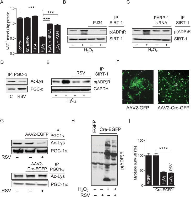 We next studied the molecular mechanism by which over activation of PARP-1 inhibits SIRT-1 function. Since SIRT-1 and PARP-1 share the same nuclear NAD+ pool, it is possible that one enzyme may influence the other's activity through competition for NAD+ [35]. Therefore, we measured the intracellular NAD+ content in myotubes treated with H2O2 and found that the treatment significantly decreased intracellular NAD+ content; however, inhibition of PARP-1 by either PJ34 or siRNAs blocked H2O2–induced NAD+ depletion (Fig. 5A). Although the depletion of intracellular NAD+ levels by PARP-1 inhibits SIRT-1 activity, it is not known whether PARP-1 also inhibits SIRT-1 activity in skeletal muscles by PARylation. Thus, we conducted IP assays using nuclear extracts from H2O2-treated myotubes with an antibody specific for PARylated proteins followed by immunoblot assays with an anti-SIRT-1 antibody. As shown in F igure 5B, H2O2 treatment had a marked increase in the level of SIRT-1 PARylation (Fig. 5B). Likewise, IP assays with an antibody specific for SIRT-1 followed by immunoblot assays with an anti-PAR antibody confirmed the H2O2-induced PARylation of SIRT-1 (Fig. 5C). However, reatment of myotubes with PJ34 or PARP-1-targeted siRNAs reversed the effect of PARP-1 on SIRT-1 PARylation (Fig. 5B and C), indicating that over-activation of PARP-1 inhibits the activity of SIRT-1 by both depleting intracellular NAD+ and PARylating SIRT-1. Next, we determined whether over activation of SIRT-1 could rescue myotubes from H2O2/PARP-1-induced cell death. Towards this end, we treated myotubes with resveratrol, which significantly increased SIRT-1 activity (Fig. 5D). Activation of SIRT-1 by resveratrol reduced PARP-1-mediated SIRT-1 PARylation (Fig. 5E). To explore the role of SIRT-1 in myotube survival, we isolated primary myoblasts (i.e. satellite cells) from SIRT-1 conditional (floxed) knockout mice (SIRT-1loxp/loxp) and infected these cells with AAV transducing either GFP or Cre (Fig. 5F). Infection of the floxed primary myoblasts with Cre, but not with GPF significantly reduced the activity of SIRT-1 (Fig. 5G). Activation of PARP-1 in AAV-Cre-infected myotubes by H2O2 significantly increased global protein PARylation (Fig. 5H) and decreased the survival of myotubes (Fig. 5I); however, treatment of these myotubes with resveratrol did not reverse the effect of H2O2 (Fig. 5H and I). These results indicate that H2O2-induced PARP-1 activation induces myotube death via inhibition of SIRT1 activity due to depletion of intracellular NAD+ and increased SIRT-1 PARylation.