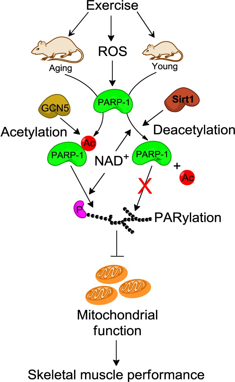 Skeletal muscle undergoes a profound age-related deterioration called sarcopenia, which is characterized by a marked decline in muscle mass and function. Although the pathogenesis of sarcopenia is complex, ROS accumulation stemming from mitochondrial dysfunction plays a key role in this process. PARP-1 is a central mediator of the response to cellular stress caused by physiological stressors, such as ROS and inflammation. While the basal activity of PARP-1 is necessary to maintain genome integrity and cellular homeostasis in response to oxidative stress, over-activation of PARP-1 induces a skeletal muscle decline that is more common in aged individuals than in younger people. Therefore, it is possible that regulation of skeletal muscle protein PARylation by PARP-1 would be different in aged people than that in younger individuals. Here, we demonstrate that in aged mice, exercise over-activates PARP-1 via GCN5-dependent acetylation in skeletal muscle and that activated-PARP-1 depletes cellular NAD+ levels, thereby inhibiting SIRT-1 activity that resulted in reduced mitochondrial biogenesis and metabolism, and increased the onset of fatigue and reduced the ability to produce and work. In contrast, SIRT1 has the ability to bind with and deacetylate PARP-1, and as a result of reduced PARP-1 activity, there is an increase in mitochondrial content and biogenesis in skeletal muscle from young mice. Interestingly, inhibition of PARP-1 in aged mice reduced the exercise-induced over activation of PARP-1 and promoted mitochondrial biogenesis via the SIRT-1/PGC-1α pathway, which resulted in an increased onset of fatigue an a decreased ability to produce total muscle work, suggesting that activation of SIRT-1 and/or inhibition of PARP-1 would be an effective way to improve muscle function in aging. As PJ34 delayed the onset (although not the extent) of fatigue, and it also improved the capacity to sustain the higher forces over the duration of the 360 contractions in our experiments, the ability to produce and sustain ATP production and delivery from the mitochondria to the muscles was presumably better when PARP-1 was inhibited. This speculation is consistent with observations of greater signaling for mitochondrial biogenesis (which would be the primary source of ATP generation) when PARP-1 was inhibited. It would have been interesting to test if the PJ34 would have markedly lowered the muscle fatigue rate as compared to control muscles throughout a sustained effort, if the muscles in both treatment groups had been required to maintain an identical absolute submaximal load over the course of the experiment (although this was not tested in the current study).