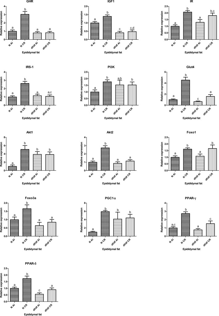 Importantly, there was a significant interaction between diet and genotype for transcript levels of GHR, IRS-1, Akt1, Akt2, GLUT4, PGC1α and PPARγ (P=0.0001, P=0.0001, P=0.0043, P=0.0007, P=0.0002, P=0.0195, P=0.0297, respectively). Additional t-test analyses showed significantly increased mRNA expression levels of GHR, IGF-1, IRS-1, PI3K, Akt1, Akt2, PGC1α and FOXO3a in epididymal adipose tissue in N-CR mice compared to their N-AL controls (P=0.0001, P=0.0029, P=0.0001, P=0.0014, P=0.0003, P=0.0001, P=0.0001, P=0.0148, respectively) with no alterations in df/df-CR when compared to df/df-AL. Expression levels of IR, GLUT4, FOXO1, PPARγ and PPARδ were significantly increased in epididymal adipose tissue of N-CR compared to N-AL mice (P= 0.0001, P=0.0001, P=0.0003, P= 0.0001, P=0.0012, respectively). There was also a significant increase in mRNA levels of IR, GLUT4, FOXO1, PPARγ and PPARδ in df/df-CR mice compared to df/df-AL controls (P=0.0429, P=0.0001, P=0.0392, P=0.0257, P=0.0320, respectively). Interestingly, expression of GLUT4 was significantly decreased in df/df-AL mice compared to their N-AL controls (P=0.0377) (Fig. 3).