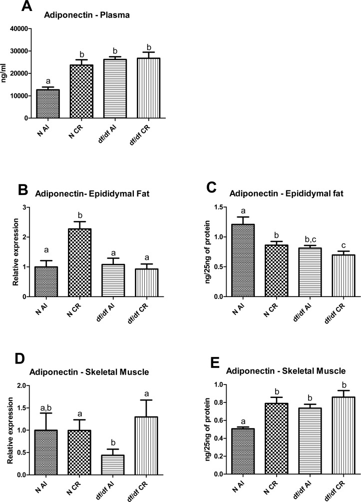 The effect of CR on adiponectin levels in epididymal adipose tissue, skeletal muscle and plasma