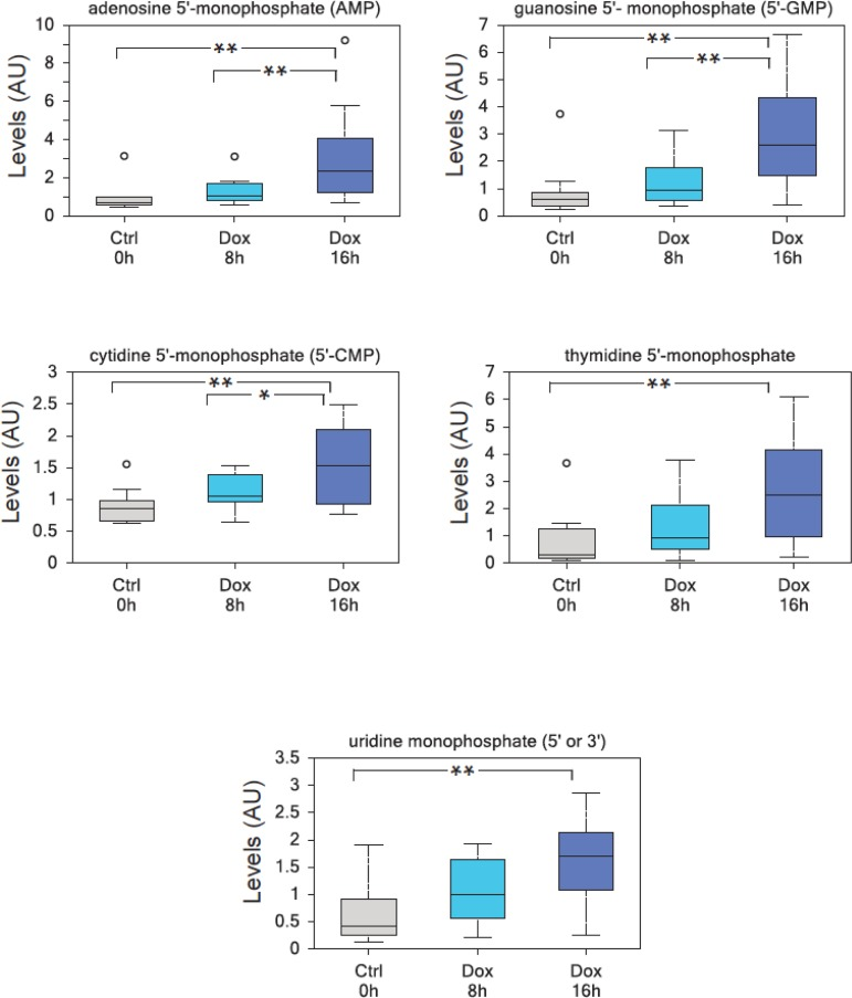 To investigate the effects of TAp73 expression on cellular metabolism, we used human p53/p73 null SaOs-2 osteosarcoma cell line, engineered to overexpress HA-tagged TAp73β isoform when cultured in the presence of the tetracycline analog doxycycline (Dox)[43] and used GC-MS and LC-MS-MS platforms to perform high throughput metabolomics [44]. With this approach, we unveiled an unexpected role for TAp73 in promoting the Warburg effect (manuscript in preparation). TAp73-expressing cells show an increased rate of glycolysis, higher amino acid uptake and increased levels and biosynthesis of acetyl-CoA (manuscript in preparation). Moreover, TAp73 expression increases the activity of several anabolic pathways including polyamine and membrane phospholipid synthesis (manuscript in preparation). In addition, nucleotide biosynthesis was significantly upregulated by TAp73. The biochemical analysis of intracellular nucleotides content is shown in Figures 1 and illustrates a sustained and significant upregulation of both purines and pyrimidines. Thus, our data indicate that TAp73 regulates multiple metabolic pathways that impinge on numerous cellular functions, but which, overall, converge to sustain “biochemical” cell growth and proliferation, in full agreement with the indicated report [35, 45].