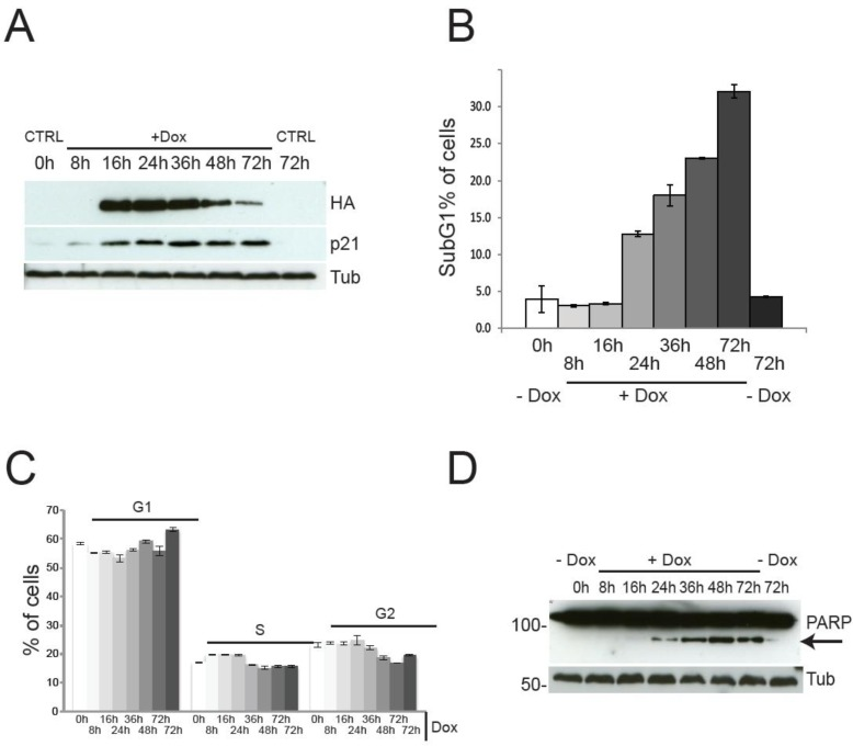 For cell cycle analysis 500,000 cells were treated for the indicated time with doxycycline 2μg/ml, collected and fixed with ice cold 70% ethanol. After O/N fixing at −20°C, cells were washed in PBS, resuspended in 50μl of 10μg/ml RNase solution (SIGMA) and incubated for 10 minutes at 37°C. 500μl of staining solution (50μg/ml propidium iodide in PBS) was added to the cells, followed by additional incubation 30 minutes at 37°C. Stained cells were analyzed by flow cytometry and at least 10,000 cells per sample were collected. Data were analyzed using CELLQuest acquisition/analysis software.