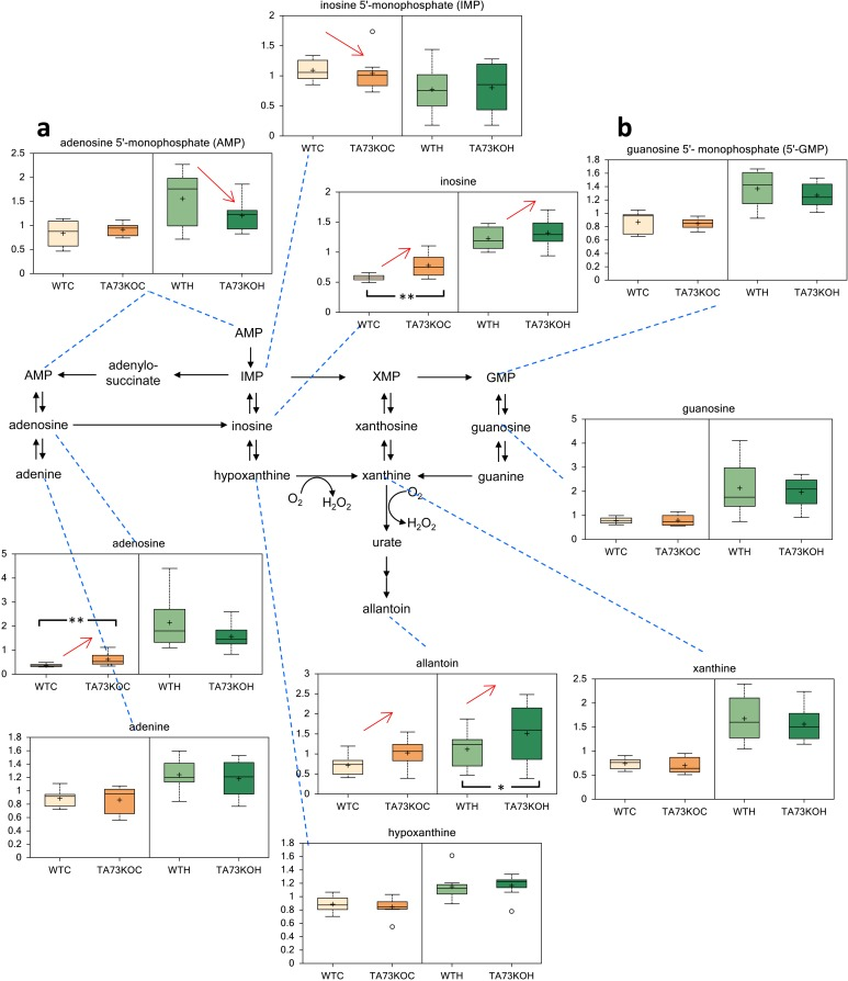 Since TAp73 exerts a relevant role in the physiology of the nervous system [38, 47-49], we analyzed cerebral cortex and hippocampus isolated from TAp73 wild-type (WT) and knockout (KO) animals [50] to question whether TAp73 regulates nucleotides metabolism in-vivo. Notably, in agreement with the in-vitro experiment, we found that purine metabolism was altered in TAp73KO brains. In particular, inosine and adenosine were significantly higher in the cortex of TAp73KO compared to WT controls. Moreover, allantoin, the final product in purine catabolism, was higher in both TAp73KO cortex and hippocampus, reaching statistical significance in the latter. On the other hand, inosine 5′- monophosphate and adenosine 5′- monophosphate were significantly reduced in the cortex and hippocampus of TAp73 KO mice, respectively. Hence, these data suggest that TAp73 regulates nucleotides metabolism in-vivo, in physiological context.