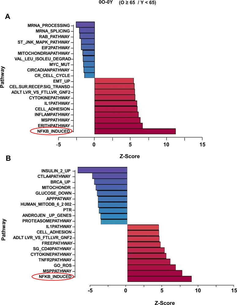 NF-κB is an inducible transcription factor that regulates gene expression in cells activated by a variety of stimuli. Gene targets in activated cells include pro-inflammatory cytokines such as IL1, IL6 and TNFα. Because high blood levels of the proteins products of these genes are hallmarks of the chronic inflammatory state of aging, NF-κB dysregulation has been implicated in the aging process [19]. However, cells or tissues that are the source of inflammatory markers found elevated in most older individuals have not been identified. Similarly, direct evidence for NF-κB dysregulation at the cellular level is lacking and, consequently, the mechanisms for such dysregulation are unknown. Interestingly, the top 10 up-regulated pathways in our analysis also included “Inflammation”, “Cell adhesion” “IL1” and “Cytokine” pathways, which also contain putative NF-κB target genes, leading us to conclude that cells from older individuals exhibit elevated expression of NF-κB target genes in the absence of overt cell stimulation.