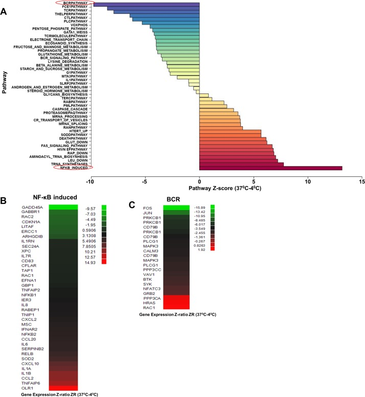 The pathway that was most down-regulated by ex-vivo incubation was the “BCR pathway (Fig. 2A),” within which significantly changed genes included immediate early response genes such as FOS and JUN, and components of BCR signaling such as CD79B and PLCγ1 (Fig. 2C). Our interpretation is that activity of the “BCR pathway” in cells maintained at 4°C reflected low-grade stimulation via TCR/MHC interactions in vivo [23]. To the best of our knowledge, this is the first demonstration of the direct gene regulatory consequence of this form of “tonic” TCR signaling. Absence of MHC ligands during the 37°C incubation of purified CD4 T cells down-regulated this pathway and replaced it with other, non-TCR dependent consequences of metabolic activity. One of the most important consequences was activation of a subset of NF-κB-dependent genes.
