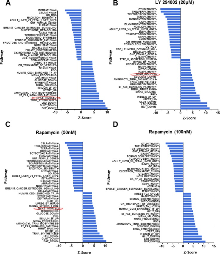 The phosphatidylinositol 3-kinase (PI3K) pathway has long been implicated in aging based on the demonstration that attenuating insulin/IGF1/FOXO activity extends lifespan in C. elegans [27]. Moreover mutation in the age-1 gene, which encodes the catalytic subunit of PI3K, also extends longevity in C. elegans [28]. The relevance of this axis for aging has been confirmed in rodents [29], and there is evidence that it is a key mediator of caloric restriction [30], the only known universal extender of life/health span across species. Accordingly, the immune suppressant rapamycin, that affects a subset of responses mediated by PI3K, is the only treatment demonstrated to prolong longevity in mammals [31, 32]. Despite substantial information in model organisms, little is known about PI3K dysregulation during human aging. To test whether exacerbation of “NF-κB-induced” pathway in CD4+ T cells from older individuals involved the PI3K pathway we assayed the effects of culturing CD4+ T cells in the presence of the PI3K inhibitor LY 294002, or rapamycin. RNA purified from these cells was used for microarray analysis. We found that 9 out of the top10 pathways up-regulated by 37°C incubation were unaffected by either drug (Fig. 3). In contrast, activation of the “NF-κB-induced pathway was substantially inhibited by pre-treatment with both LY 294002 and with rapamycin (Fig. 3B-D).