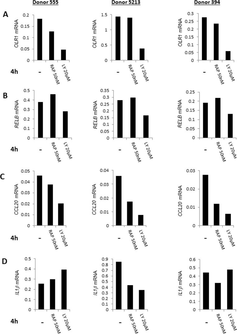 We validated these observations by quantitative-RT-PCR analysis using RNA from three additional individuals. OLR1, RELB and CCL20 gene activation was consistently reduced in the presence of LY 294002 in CD4+ T cells from three independent donors (Fig. 4A-C) (Fig. S4A-D). We conclude that PI3K affects cell-intrinsic induction of NF-κB target genes. The observed variability and the incomplete suppression (e.g. of RELB) was entirely consistent with the more global gene expression analysis that indicated that activation of the NF-κB-induced pathway was not completely abrogated by either drug. An additional example of variability was demonstrated by analysis of IL-1β gene induction whose expression was suppressed in only one out of the three subjects. Unlike the observed effects with LY 294002, specific NF-κB target genes that we analyzed by quantitative RT-PCR were not suppressed by rapamycin. This is consistent with the greater involvement of mammalian target of rapamycin (mTOR) with protein translation rather than transcription [33]. We conclude that age-associated elevation of NF-κB target gene expression as a consequence of cell-intrinsic metabolic activity is mediated in part by PI3K.
