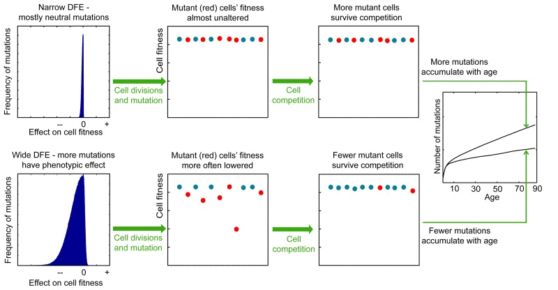 To infer the nature of DFE in HSC pools, we applied the logic that mutation fitness effects will affect competition and selection processes by creating a fitness differential in a population of cells. A narrow DFE with mostly neutral mutations will result in a largely drift-driven population, where the chance of survival is random (Fig. 1; upper panels). A wide DFE, where a larger proportion of mutations have fitness effects, will engender a broader fitness differential among cells within a population. This fitness differential lends itself to natural selection, wherein cells with disadvantageous phenotypes are less likely to survive into subsequent generations. As most functional mutations are likely to decrease fitness (residing in the negative tail of the DFE), we reasoned that variance of DFE should have an effect on the slope of mutation accumulation in HSCs, whereby wide variance (more functional mutations) should act to purge mutated cells with decreased fitness from the pool and thus act to lower the speed of mutation accumulation in the population (Fig. 1; lower panels).