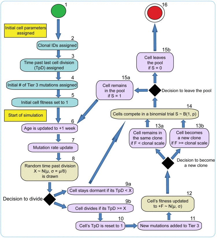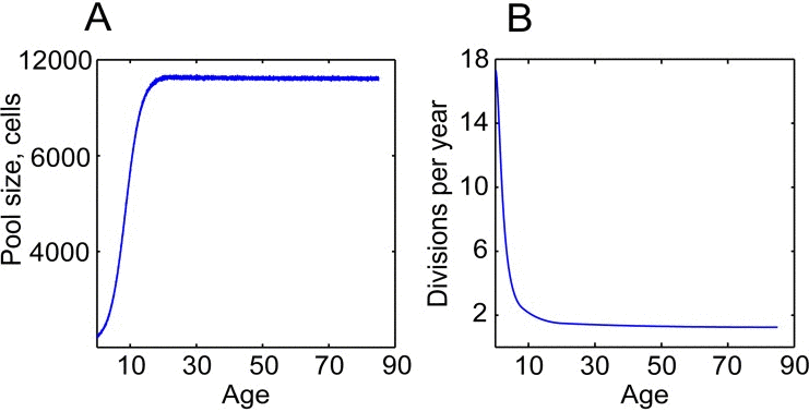To fully investigate the many parameters governing somatic evolution in HSC pools, we designed a stochastic model to replicate HSC population dynamics, to simulate the impact of mutations in HSCs over human lifetimes, and to model the effects of tissue microenvironment on selection and clonal expansion within the HSC pool. This model is a stochastic, discrete time continuous parameter space model realized in a Monte Carlo experiment run in the Matlab programming environment (The MathWorks, Inc., Natick, Massachusetts). A chart of cell fate decisions in the simulated HSC pool during a model's run is shown in Fig. 2. The model starts with a matrix of the initial number of HSC, and each cell's state is updated on a “weekly” basis throughout the simulated lifespan of 85 years (4420 weeks). The weekly update included stochastic cell fate decisions to divide or stay dormant based on estimated HSCdivision rates throughout life (modeled based on published data; Fig. 3), and to stay in the pool or leave for whatever reason (such as death or differentiation) based on niche space availability, current number of competing cells at different ages (modeled based on published data for HSC pool size; Fig 3), and each cell's relative fitness. Cell fitness changed after each division stochastically, initially based only on mutation DFE. Cells that diverged in fitness more than a certain threshold from their parental cells upon division were designated as new clones, thus replicating functional (clonal) divergence of HSC in the pool with age (Fig. S1A-B). The code and detailed parameter description and justification are presented in Supplemental Methods.