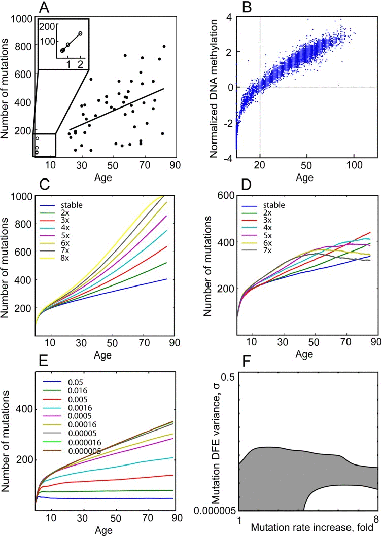 Mutation accumulation in the Tier 3 genome can be used as a marker for overall mutation accumulation rates. Tier 3 represents (to best approximations) the non-conserved, non-coding, and non-repetitive sequences of the genome, spanning ~1 billion base pairs [51]. The vast majority of Tier 3 DNA should therefore not be under selection (particularly in somatic cells), and mutations in Tier 3 should (with rare exceptions) not alter cellular phenotype. But the accumulation of these passenger mutations will depend on the intensity of purifying selection acting on functional mutations (including epigenetic alterations) as shown in Fig. 1, and can be used to infer the intensity of selection and thus the parameters of mutation DFE acting on HSC. Basically, increased accumulation of mutations with detrimental phenotypic effects will confer a fitness cost to cell division. We will use our model to determine the parameters of mutation DFE and rate increase over a human lifetime that can replicate experimentally determined mutation accumulation in the Tier 3 genome of HSC.