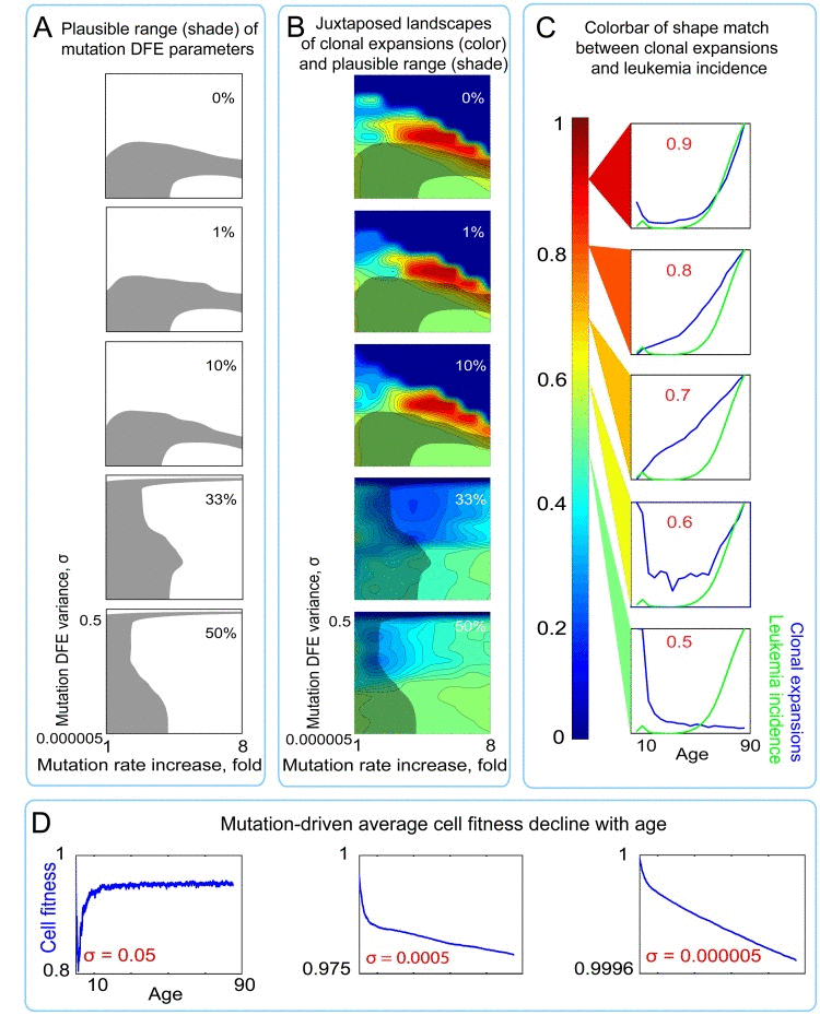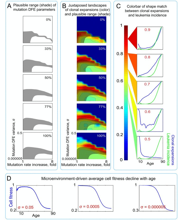 Our results indicate that parameters of the mutation process that would concomitantly allow for exponentially increasing rates of somatic evolution (incidence of leukemia) and significant functional decline in HSC, with both being driven and rate-limited by cell-intrinsic genetic damage accumulation with age, are unlikely to exist. Our modeling instead indicates that a common set of mutation DFE and rate parameters can only be defined under the dynamic, environment-dependent paradigm of fitness. Thus, these results argue that the late life increased incidence of hematopoietic malignancies is not rate-limited by the occurrence of oncogenic genetic damage events, but results from microenvironment-imposed increases in positive selection for previously accumulated genetic/phenotypic diversity in aged tissues.