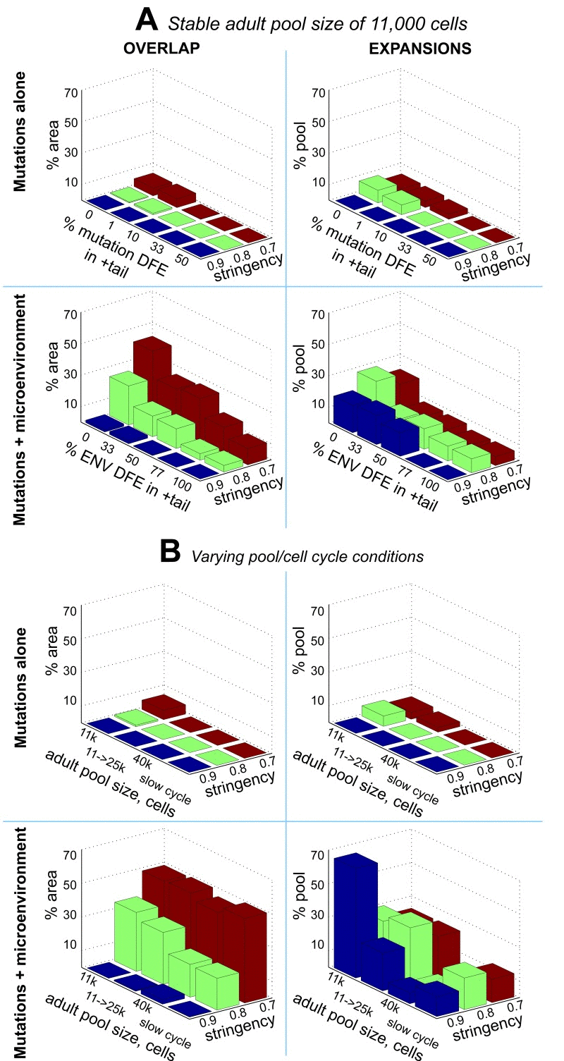 We applied this additional bicomponent modification of mutation fitness effects by microenvironment and tested the same series of outputs in a composite model, varying the proportion of the microenvironment-imposed DFE (ENV DFE) that resides in the positive tail. The composite model results in an extensive overlap between the plausible range (shaded areas in Fig. 8A,B) and conditions allowing for exponential age-dependent increase in clonal expansions (red areas in Fig. 8B; see color bar in Fig. 8C). Moreover, the magnitudes of these clonal expansions are substantially higher in the composite versus the mutations-only model (Fig. 6; Table S1). Both the extent of overlap and the magnitude of clonal expansions are maximal for a small (0-1%) positive tail for microenvironment-imposed DFE. As shown in Fig. 8D, the overwhelming cumulative effect of the microenvironmental uniform component results in the expected substantial average fitness drop, but without promoting excessive purifying selection to buffer fitness decline. In this way, the bi-component model of tissue microenvironment effects, by interacting with the mutation pre-generated cellular diversity, creates a range of mutation DFE variance and rate increase that are concurrently permissive for realistic mutation accumulation, exponential age-dependent increase in rates of somatic evolution (clonal expansions), and realistic cell fitness decline.