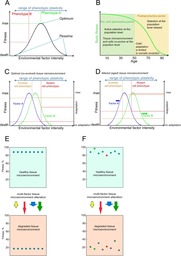 The principle for how the Sprengel-Liebig's system defines the fitness of a given phenotype is shown in Fig. 7. In aggregate, any given phenotype has a certain degree of adaptation to each environmental factor so that the factor has its optimal intensity (e.g. optimal concentration) and extreme intensities, also called pessima (Fig. 7A). Fitness decreases as the intensity of a factor in the environment changes from the optimum to either of the pessima for a given phenotype, a phenomenon known as Shelford's Law of Tolerance [63]. Selection leads to improved adaptation so that populations consist of phenotypes for which a given environment is optimal. We argue that selection at the germline level should lead to co-evolution of stem cells and tissue microenvironment to optimize performance during pre- and reproductive periods (Fig. 7B). In a complex, multi-factorial environment a phenotype will have different degrees of adaptation to each particular factor, but the phenotype's net fitness will be limited by its adaptation to the factor it is least adapted to, called the limiting factor, following Sprengel-Liebig's Law of the Minimum (Fig. 7C) ([15, 64]). General adaptation to a complex environment leads to the evolution of phenotypes that have optimal net fitness (“evolved phenotype” in Fig. 7C), and this process reduces the likelihood that new phenotypes that arise from random mutations will improve fitness relative to the population as it becomes better adapted.
