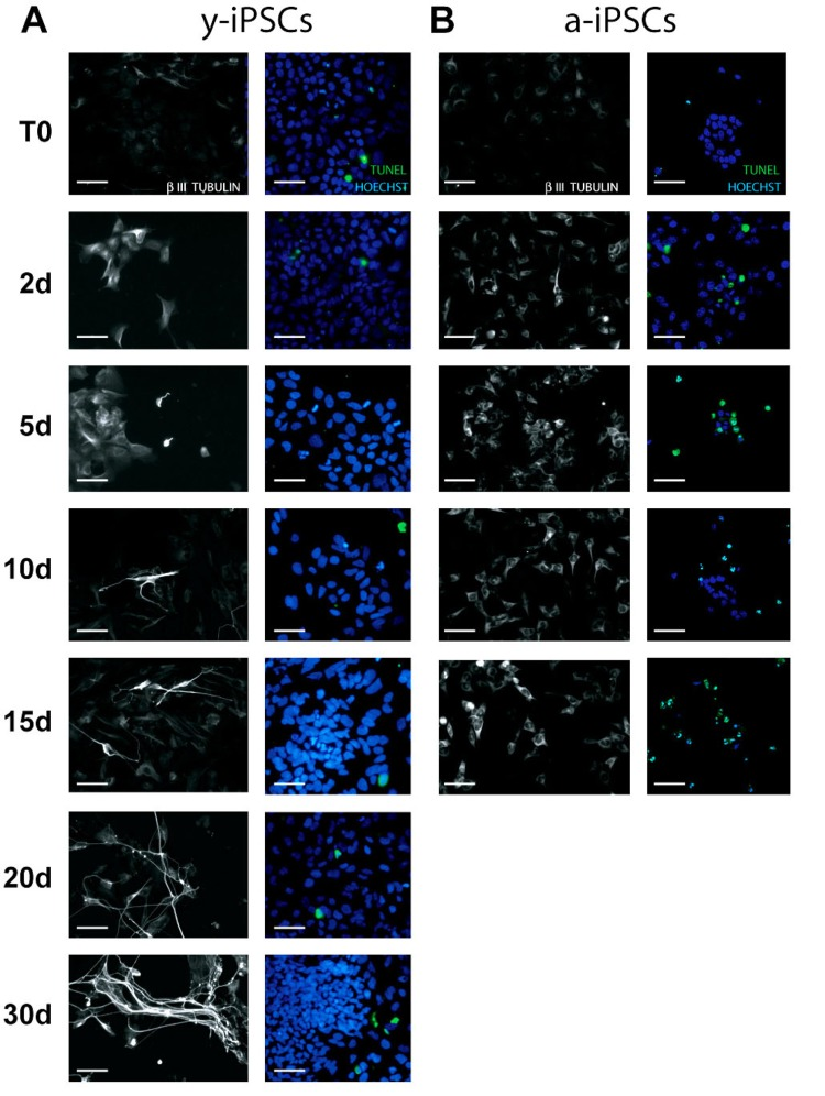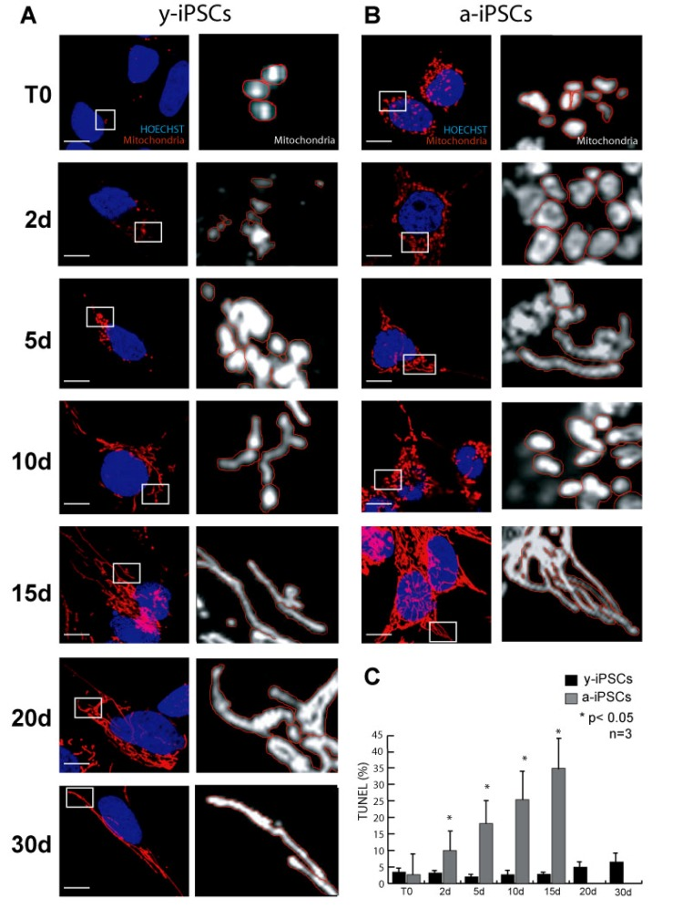 Having established that a-iPSCs present alterations of their mitochondrial number, we investigated whether this cellular alteration compromises the ability of iPSCs to differentiate. Since the balance between cell proliferation and differentiation relies on the mitochondrial state of the cell, we compared the mitochondrial development and the differentiation potential of y- and a-iPSCs. With this aim and considering that the neuron is the cell with the highest number of mitochondria [23], we differentiated iPSCs into motor neurons (Fig. 2). In optimal conditions (chemically defined differentiating medium), 95-99% of iPSCs differentiate into motor neurons after 30 days. The main features of mature neurons are the positivity to the neuronal marker β-III-TUBULIN and the formation of elongated and branched neurites (Fig. 2). At the beginning of in vitro neurogenesis (T0), mitochondria of y-iPSCs were few and had a rounded shape but they increased in number and acquired the elongated and mature morphology of an organized mitochondrial network from day 10 (10d) to day 30 (30d) of differentiation (Fig. 1A). At T0, mitochondria of a-iPSCs displayed a rounded shape similar to that of y-iPSCs mitochondria, were more abundant than in y-iPSCs and further increased in number during differentiation (Fig. 1B). On the contrary, a-iPSCs failed to complete the differentiation into motor neurons. In fact, after 15 days (15d) in differentiating condition a-iPSCs did not show neither elongated nor branched neurites, mitochondria formed a convoluted network which occupied most of the cytoplasmic space and cells underwent apoptosis (Fig. 1B, and 2B). These findings suggest that a-iPSCs lost the ability to differentiate properly. One reason that may explain this behavior is that a-iPSCs have already a great number of mitochondria in the proliferation status, which cannot increase further after the trigger to differentiate into neurons. This determines a dysfunctional mitochondrial status that induces iPCSs to initiate apoptosis. It has been reported that mitochondrial dysfunctions lead to cell death [24, 25]. Therefore, by TUNEL assay we measured the percentage of apoptotic cells during differentiation, finding that y-iPSCs had a negligible number of apoptotic cells (<6.5%) throughout the differentiation period, whereas a-iPSCs increase the number of apoptotic cells from 2.6% (at T0) to 34.79% (at 15d) (Fig. 1C and 2). This is in agreement with the arrest of differentiation at 15d in a-iPSCs.