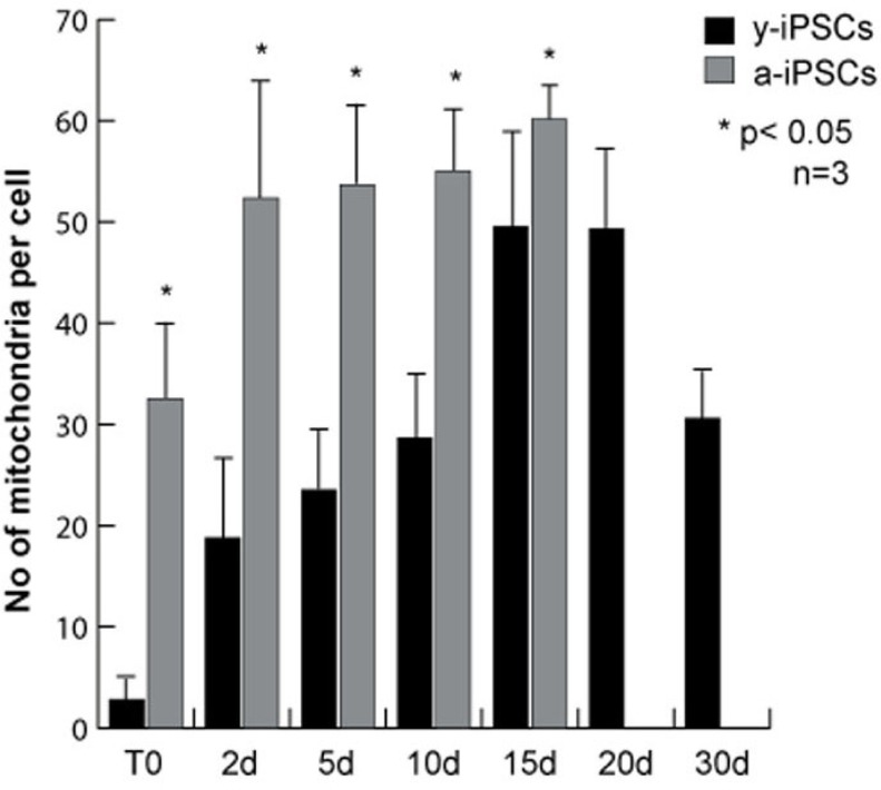 To study the morphology and the number of iPSC mitochondria, we performed immunofluorescence assays for α-mitochondria on young iPSCs (named y-iPSCs) kept in culture for 1 month after reprogramming, and on aged iPSCs (named a-iPSCs) that have been cultured for more than one year (Fig. 1 and 2). We observed that y-iPSCs have a reduced number of mitochondria (2.85 ± 1.43 per cell) compared to a-iPSCs (32.55 ± 9.90 per cell) (Fig. 1A, and 3). These data suggest that long-term maintenance of iPSCs in culture may alter the number of mitochondria.
