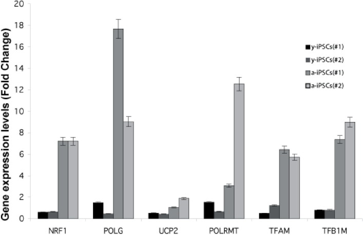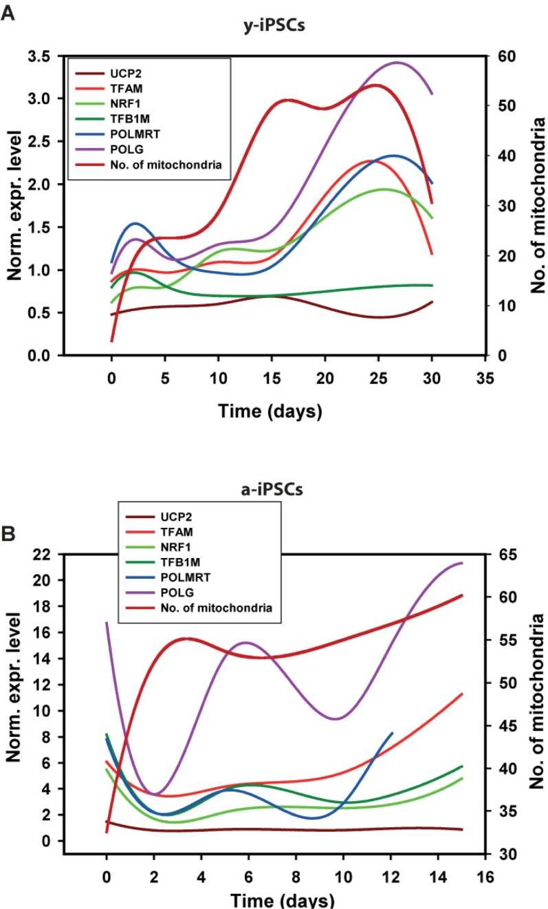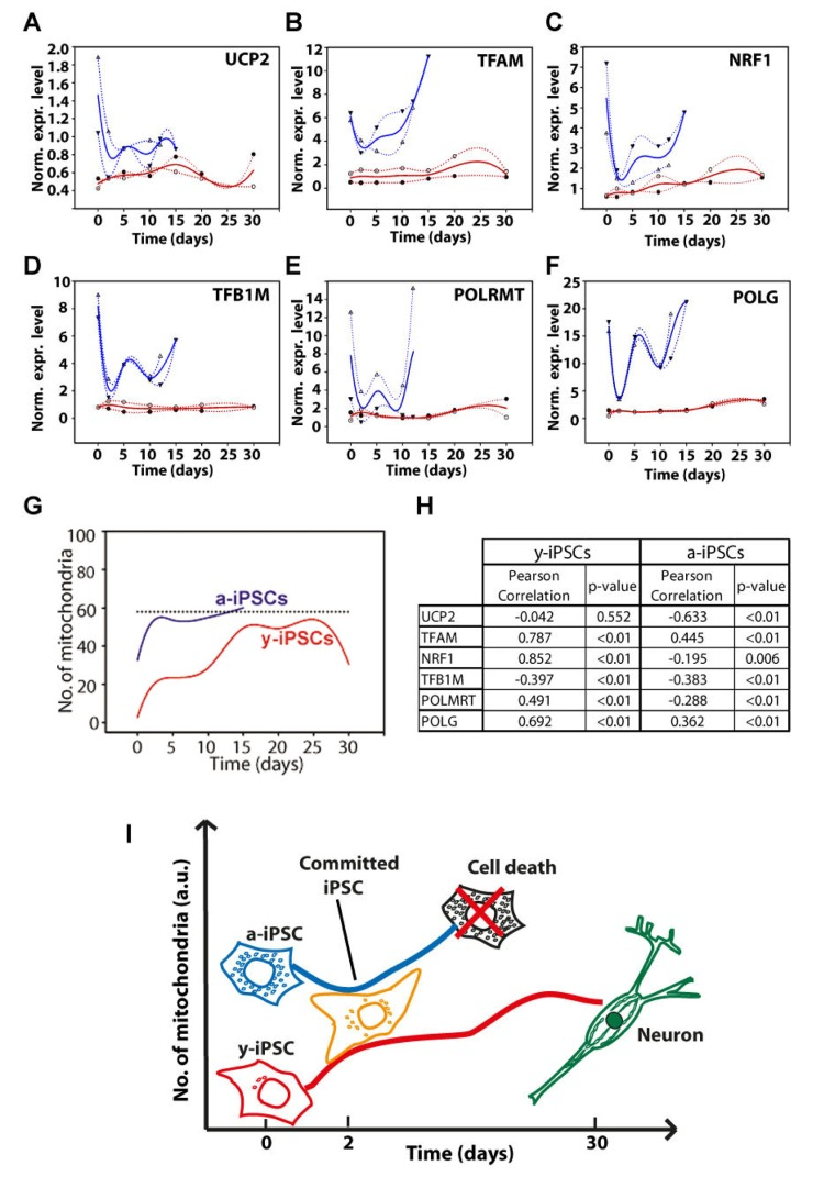Next, we investigated if these expression data could correlate with the increased number of mitochondria. Therefore, we quantified the number of mitochondria in y- and a-iPSCs and performed a correlation (Pearson's) analysis (Fig. 4G, H). Interestingly, in y-iPSCs the expression values for all genes, but UCP2, significantly (p<0.01) and directly correlate with the increasing number of mitochondria during differentiation (Fig. 4H and 6). Only TFB1M inversely correlate to it. In a-iPSCs, all of the genes are significantly (p<0.01) inversely correlated with the number of mitochondria except TFAM and POLG that are directly correlated. Noteworthy, the only two genes that are positively correlated with the number of mitochondria in both y- and a-iPSCs are TFAM and POLG that displayed also the greatest gene expression level at d25-30 for y-iPSCs (Fig. 4B) and d15 for a-iPSCs (Fig. 4F and 6).