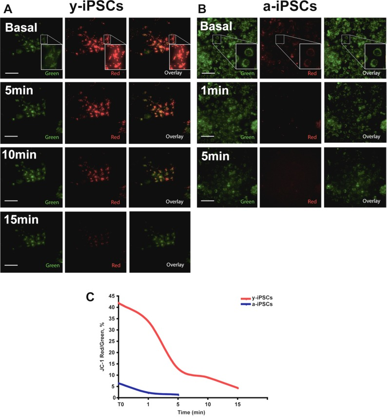To determine the mitochondrial activity in y- and a-iPSCs, we measured their mitochondrial membrane potential (MMP) in basal condition and after H2O2 exposure by JC-1 staining (Fig. 7). JC-1 is a cationic dye that presents potential-dependent accumulation in mitochondria and indicates their polarization by a fluorescence emission shift from green (525 nm) to red (590 nm). In particular, regions of high mitochondrial polarization are revealed by red fluorescence due to the J-aggregate formation of the concentrated dye, whereas depolarized regions are indicated by the green fluorescence of JC-1 monomers. Therefore, JC-1 staining allows to monitor mitochondrial depolarization, which is indicated by a decrease in red/green fluorescence intensity ratio. We found that MMP in basal condition was decreased in a-iPSCs when compared to that of y-iPSCs (Fig. 7). Moreover, we monitored JC-1 staining following exposure to H2O2 and observed a progressive loss of red J-aggregate fluorescence in y-iPSCs from 5 to 15 minutes (Fig. 7A). On the contrary, under basal condition the red J-aggregate fluorescence of a-iPSCs was less intense than that of y-iPSCs and the observed fluorescence decrease was faster (~1 minute after H2O2 treatment), and disappeared after 5 minutes (Fig. 7B). In conclusion, these results emphasized that H2O2-dependent MMP depolarization in a-iPSCs is faster than that observed in y-iPSCs and, that the different ability of y- and a-iPSCs to counteract oxidant exposure is linked to their different MMP under basal condition.