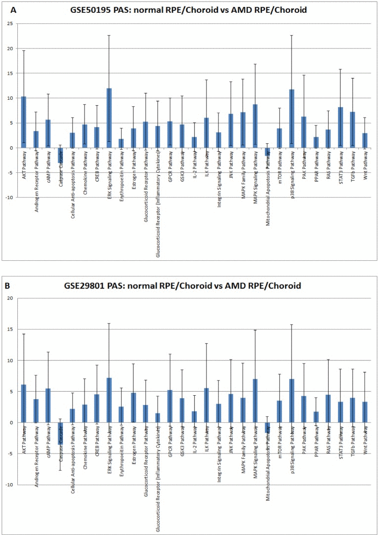 As stated, pathway activation analysis was performed using “AMD Medicine” developed by Vision Genomics LLC using signaling pathway activation analysis algorithms (SPAS) [35]; we picked two sets of transcriptome profiles generated from normal and AMD affected RPE-choroid human tissues. The first dataset, GSE50195, evaluated gene expression levels in 9 human donor eyes with early AMD, and 7 control human donor eyes using the Affymetrix Human Exon ST 1.0 arrays. The second dataset, GSE29801, evaluated gene expression levels in 31 normal, 26 AMD, and 11 potential pre-AMD human donor eyes using the Agilent-014850 Whole Human Genome Microarray 4×44K. Raw data files from the GEO NCBI website were pre-processed using R Bioconductor.