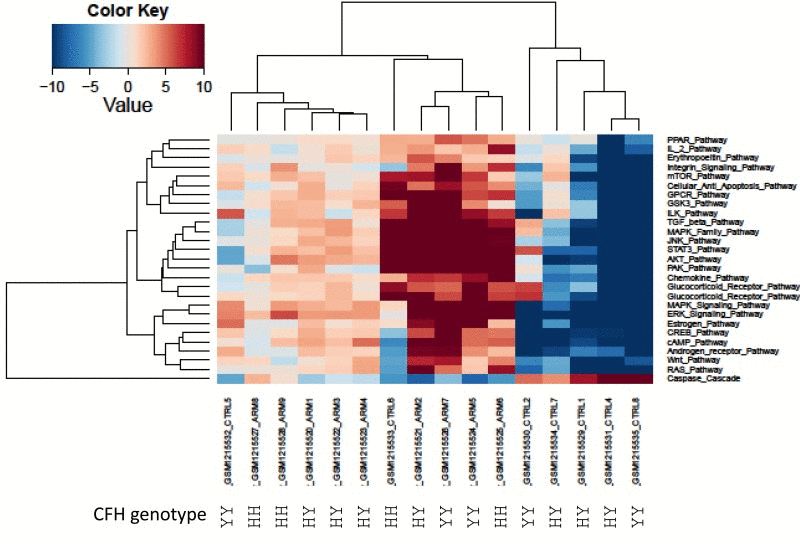 Since AMD has several well-known genetic variations directly associated with high risk of AMD development, we investigated the genetic background available in one of the datasets (GSE50195). We used complement factor H genotype (rs1061170 SNP) [52] information to conduct cluster analysis with pathway activation values obtained from the GSE50195 dataset (Figure 2.) Our analysis revealed three major groups of samples: two groups of AMD and one group of control. Samples with low risk rs1061170 SNP variation, which was present only in two AMD samples, cluster together. These findings clearly demonstrate heterogeneity of the AMD cohort (Figure 2.).