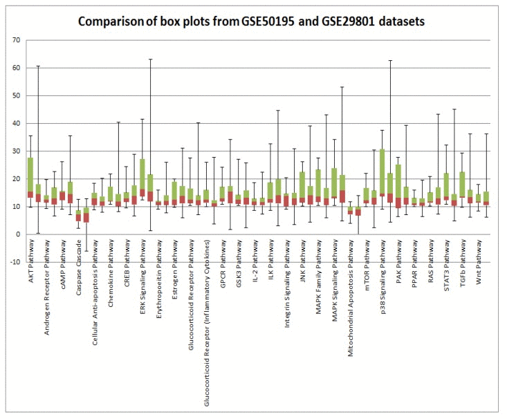 In order to validate our results, we analyzed two independent data sets obtained in two independent experiments. High variability of PAS values could be attributed to postmortem RNA degradation; despite all quality control measures it is very difficult to preserve all samples in the same way. An additional source of variability is different or misinterpreted AMD stage. There is still an open question regarding AMD disease etiology: is it a single multi symptom disease, or several diseases under the AMD manifestation umbrella? Such discrepancies could introduce a huge source of variability. Mainly to address these issues, we used data from two independent microarray experiments. Despite high variability of PAS values for almost all pathways for each data set, box plots perfectly illustrate the strong similarity of PAS values between both data sets (Figure 3). Transcriptional heterogeneity in human donor eye tissue can arise from multiple factors, including normal genetic variation, environmental influences unrelated to AMD, the presence of mixed cell types, and/or variable degrees of AMD progression.