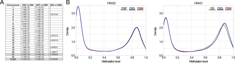 To provide a global overview of the DNA methylation patterns of DS, we first compared the beta-values distributions of each chromosome between DSP, DSS and DSM. Significant differences between DSP and their relatives were observed for most chromosomes (Fig.1A). The most striking differences were observed in HSA21 (Fig.1A and Fig.1B), where DSP showed a decrease in the density of highly methylated loci with a concomitant enrichment in loci with methylation levels between 0.5 and 0.8.
