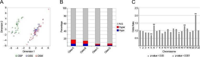 Methylation values of Class C and Class D probes were compared between DSP and DSS by ANOVA, correcting for sex, batch and cell types distribution. 6051 CpG probes out of 109617 probes mapping in Class C and 3426 out of 54697 of probes mapping in Class D were differentially methylated between DSP and DSS (q-value < 0.05; Fig.2B and Supplementary Table 1).