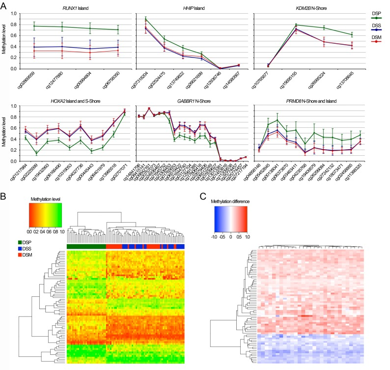 To provide an unambiguous epigenetic signature of DS, from the list of 4648 Class A BOPs altered in DSP we selected a short list of DMRs whose DNA methylation status was remarkably different compared to healthy sibs. To this aim, we considered only the BOPs containing at least 2 adjacent CpG sites for which the DNA methylation difference between DSP and DSS was higher than 0.15, as previously suggested [32]. Of the 4648 BOPs selected above, 68 met these more stringent criteria (Supplementary Table 2). Fig. 3A reports the DNA methylation profile for some of the selected BOPs. Hierarchical clustering analysis showed that the methylation status of the 68 loci clearly separated DSP from DSS and DSM, while it did not distinguish DSS from DSM (Fig. 3B). 73% of the probes included in this epigenetic signature were hypermethylated in DSP respect to DSS.