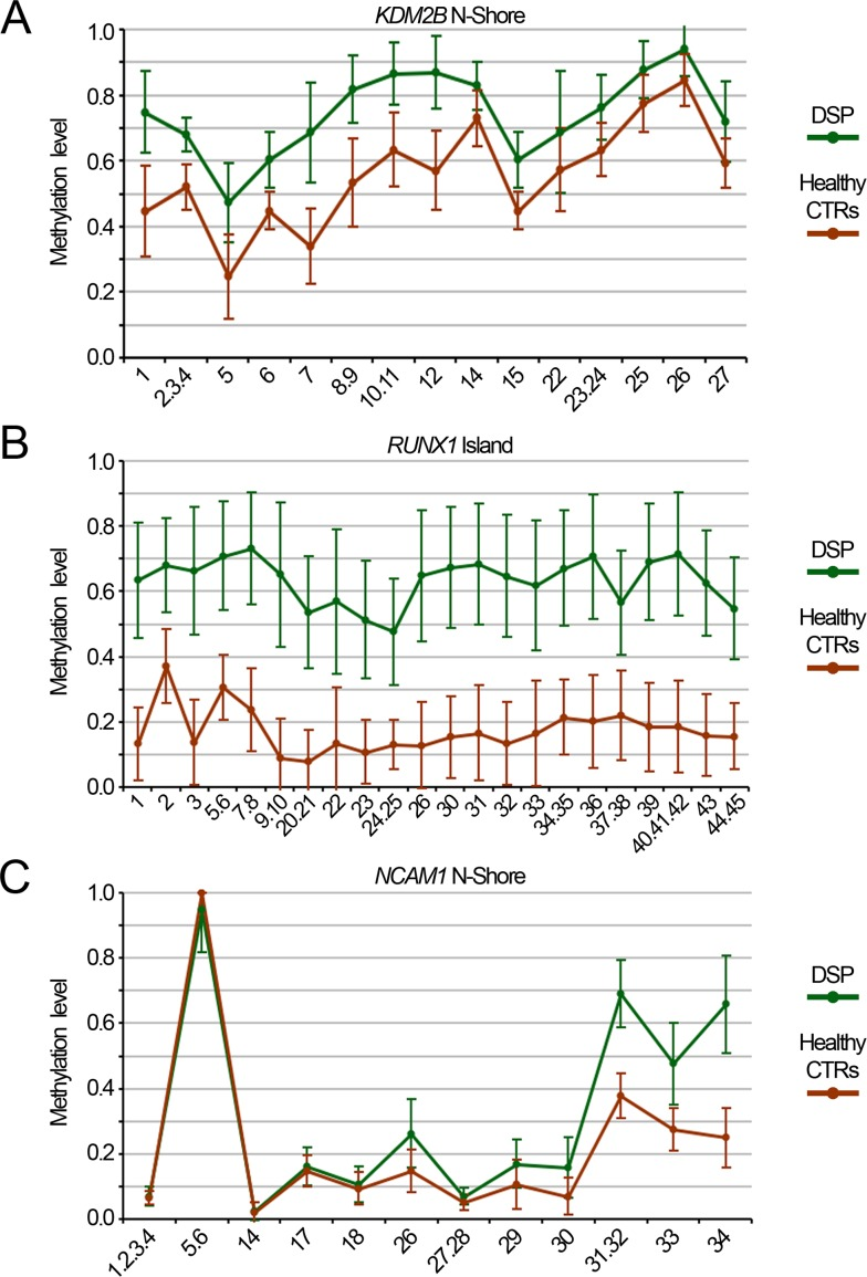 Finally, we validated 3 of the DMRs included in the epigenetic signature of DS (RUNX1 island, KDM2B N-Shore and NCAM1 island) using an alternative method, the Sequenom's EpiTYPER assay. Besides the 29 DSP and 29 DSS used for genome wide DNA methylation analysis, the validation cohort included additional 49 DSP and 33 age- and sex- matched unrelated controls. EpiTYPER analysis confirmed that the CpG sites included in the 450k BeadChip were differentially methylated between DSP and controls and showed that the DMRs extended also to the adjacent CpG sites. In particular, in RUNX1 and KDM2B amplicons all the CpG sites resulted significantly hypermethylated in DSP respect to controls (Fig. 4A and Fig. 4B; Student's t-test). On the contrary, only 7/11 of the CpGs assessed in NCAM1 island were significantly different between DSP and controls (Fig. 4C). As DS can be characterized by total or partial trisomy, we checked whether this could affect the methylation of these DMRs. No significant difference between free trisomy and translocation or mosaicism was found (data not shown).
