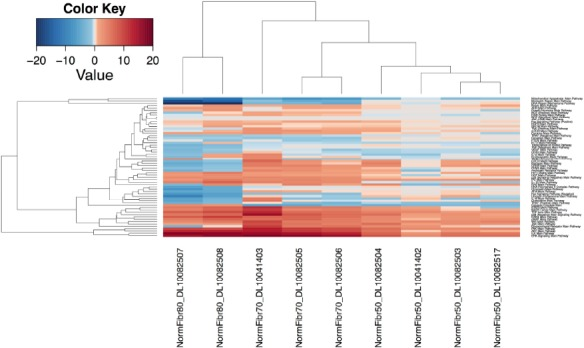 Hierarchical clustering heatmaps were generated using ‘heatmap.2‘ function from ‘gplots’ package [59]. Pearson's correlation plot with hierarchical clustering of samples was built using ‘corrplot’ package [60]. Principal component analysis was done using the ‘prcomp’ function in the ‘stats’ package. For determining similarities of pathways between investigated groups statistical equivalence tests were conducted. They test the null hypothesis of difference in distribution of PAS value between conditions against the alternative hypothesis that these distributions are similar. For pairwise comparison of two conditions, an equivalence t-test was used. For comparison of three and four conditions we performed an equivalence F-test (equivalence one-way ANOVA test). Equivalence intervals were chosen according to referenced values from [61], so that all tests are comparable (0.74 for t-test and 0.74/sqrt(2) for F-test). Significance was established using significance level 0.05.