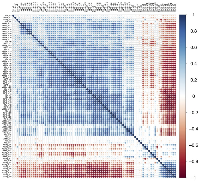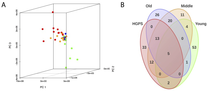 All of the samples gathered from these datasets were divided into four groups: young, middle, old and HGPS fibroblasts. The “Young”, “Middle”, “Old” groups were formed according to the donor's age. “Young” group consisted of skin fibroblasts collected from donors of 15-30 years old, “Middle” - 40-55 y.o., “Old” - 60+ y.o.