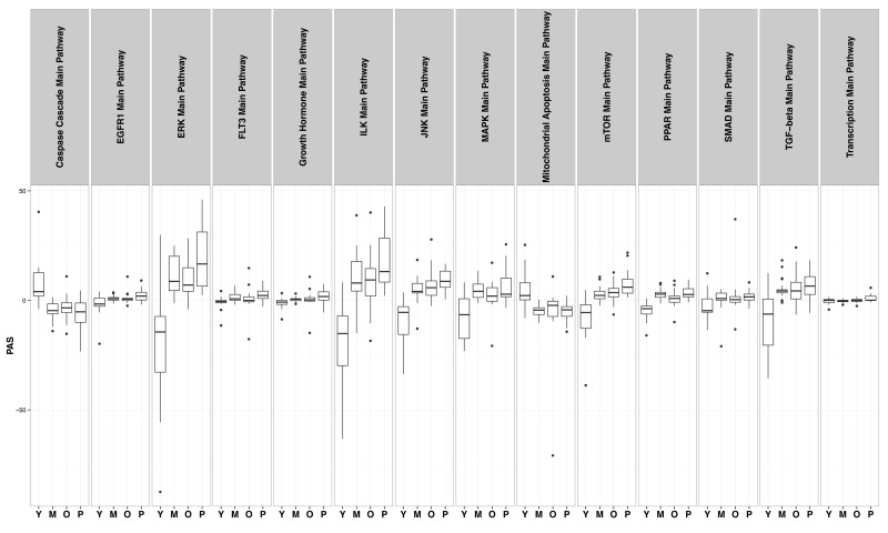 Each preprocessed gene expression dataset was independently analyzed using an algorithm called OncoFinder [22] implemented in a new platform for analyzing signaling pathways in aging called GeroScope. Taking the preprocessed gene expression data as an input it allows for cross-platform dataset comparison with low error rate and has the ability to obtain functional features of intracellular regulation using mathematical estimations. For each investigated sample it performs a case-control pairwise comparison using Student's t-test, generates the list of significantly differentially expressed genes and calculates the Pathway Activation Strength (PAS), a value which serves as a qualitative measure of pathway activation. Positive and negative PAS values indicate pathway up- and down-regulation, respectively. In this study the genes with ∣fold-change∣≥1.5 and FDR-adjusted p-value<0.05 were considered significantly differentially expressed.