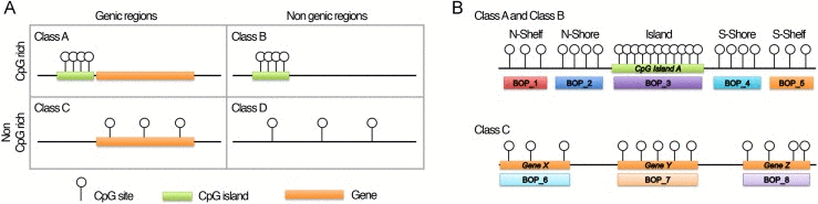 Then, we defined BOPs as follows (Fig. 1B): for probes mapping in CpG islands and in CpG islands surrounding regions (Class A and Class B), we grouped the CpG probes localized in the same island, in the same shore or in the same shelf; for probes mapping in not CpG rich genic regions (Class C), we grouped the CpG probes mapping to the same gene. Class D probes were not grouped because they were highly interspersed across the genome.