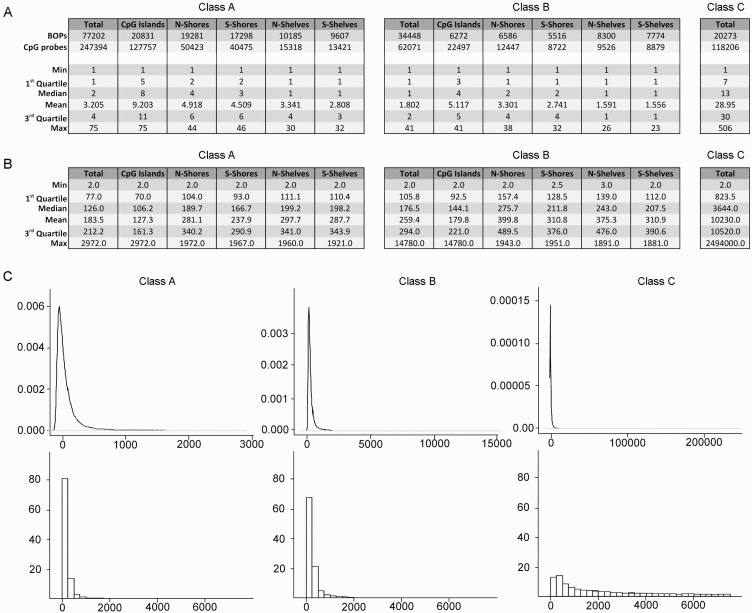 Class A, B and C included 77202, 34448 and 20273 BOPs respectively (Fig. 2). Class A BOPs mapped mainly to CpG islands and shores, but CpG islands BOPs were definitely richer in CpG probes (Fig. 2A, left panel). Class B BOPs mapped to shelves with higher frequency than Class A BOPs, but also in this case CpG probes mapped mostly to CpG islands (Fig. 2A, middle panel). As expected Class C BOPs contained a very high number of CpG probes, with a median of 13 and a maximum of 506 (Fig. 2A, right panel).