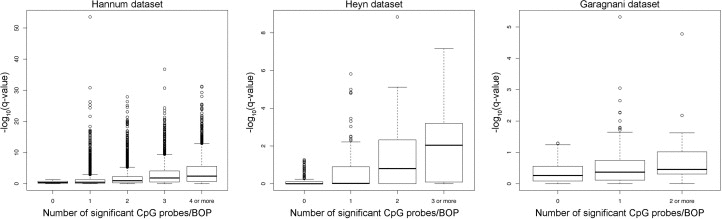 To validate our approach, we compared the results of the region-centric approach with the results of a single-probe approach by analysis of variance (ANOVA). As shown in Figure 4, the number of significant CpG probes per BOP tended to be higher in the top ranking BOPs identified by the region-centric analysis. In most the cases, significant CpG probes within the same BOP concordantly moved towards hypermethylation or hypomethylation in younger compared to older subjects. Notably a small number of the selected BOPs in the three datasets included slightly differentially methylated CpG probes that did not reach the significance threshold by themselves, but whose concomitant variation with adjacent probes within the same BOP resulted significant when analysed by a multivariate approach. These results indicate that our approach was successful in identifying chromosomal regions, rather than single CpG sites, whose methylation status is affected by aging.