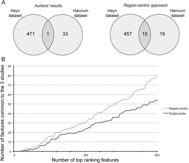 Secondly, we considered a progressively increasing number of significant BOPs (region-centric analysis) and CpG probes (single-probe analysis) and we calculated the number of common DMRs between the three datasets. As shown in Figure 5B, the extent of overlap was higher for the region-centric approach compared to the single-probe approach.