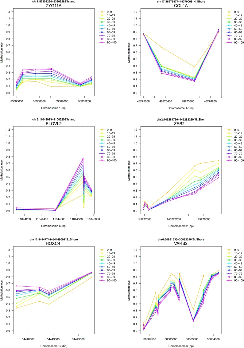 Using the Infinium 450k, researchers have identified several CpG sites that either get hypermethylated or hypomethylated during aging in different tissues [11], and a subset of these CpG sites has been successfully combined in predictors of chronological age [12, 13].