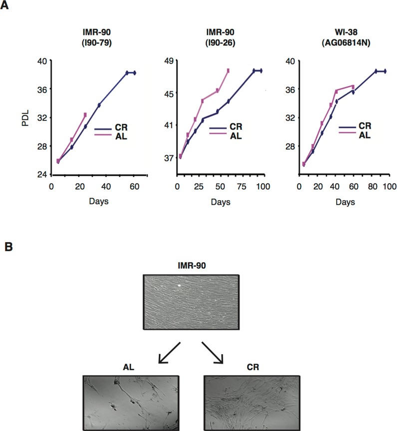 Normal human diploid cells grown in vitro exhibit a restricted population doubling potential and eventually enter an irreversible growth-arrested state known as replicative senescence, which has been proposed to reflect cellular ageing [45,46]. To determine whether CR can affect senescence entry and lifespan of normal human diploid fibroblasts in vitro, three independent normal human fibroblast cell lines were subpassaged in media supplemented with either 10 % CR rat serum or 10% AL rat serum, and analyzed until they reached senescence. Figure 1A shows the growth curves under these conditions for the three cell lines tested, namely IMR-90 (I90-79) (left panel), IMR (I90-26) (middle panel), and WI-38 (AG06814N) (right panel). Exposure of cultured IMR-90 (I90-79) and WI-38 cells to CR serum induced a significant increase in population doubling levels (PDL) and all three cell lines showed a profound delayed in the onset of senescent growth arrest. The average lifespan (cumulative PDL time) of these cells in the presence of CR serum was markedly increased when compared to that of cells grown in medium containing AL serum.