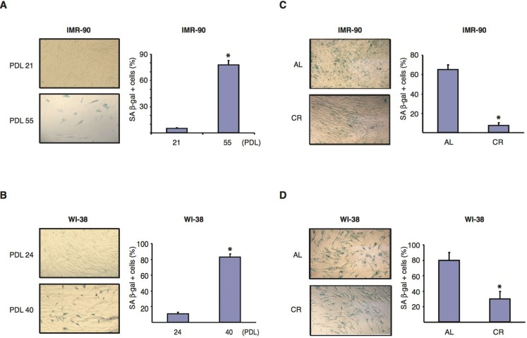 CR serum treatment reduces SA-β-gal activity in normal human diploid fibroblasts