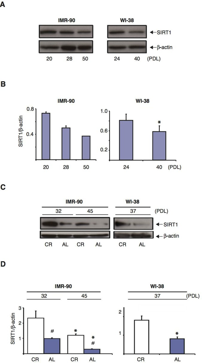 IMR-90 fibroblasts grown in the presence of 10% rat AL serum also showed a marked decline in SIRT1 levels from early (PDL 32) to late (PDL 45) passages Fig. 4C and D, left panels). Interestingly, despite the fact that IMR-90 fibroblasts grown in the presence of 10% rat CR serum also experienced a reduction in SIRT1 levels from PDL32 to PDL45, the overall SIRT1 protein levels in these cells were much higher than those observed in AL serum-treated controls. Specifically, the amount of SIRT1 protein found in IMR-90 fibroblasts grown in the presence of CR serum at PDL45 was 15-20% higher than that present in IMR-90 fibroblasts grown with AL-serum at PDL32 Fig. 4C and D, left panels). CR rat serum also preserved SIRT1 protein levels in WI-38 fibroblasts when compared to AL rat serum treatment at an intermediate (PDL 37) passage number Fig. 4C and D, right panels). These results indicate that CR serum treatment significantly prevents the senescence-associated SIRT1 downregulation displayed by normal human fibroblasts in vitro.